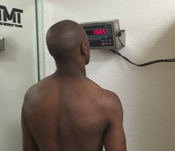 | Mayweather đạt trọng lượng 150,5 lbs (tương đương 68,2 kg) ở lần kiểm tra đầu tiên. Ảnh: Daily Mail. |