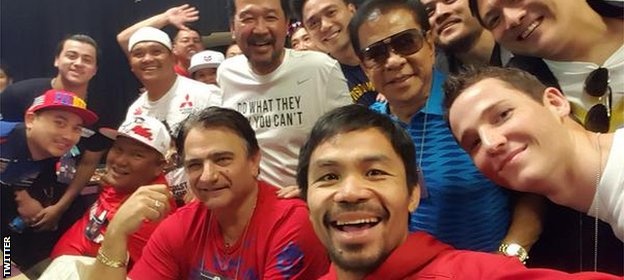 | Pacquiao vui vẻ chụp ảnh selfie cùng người hâm mộ sau buổi kiểm tra trọng lượng. Ảnh: BBC. |