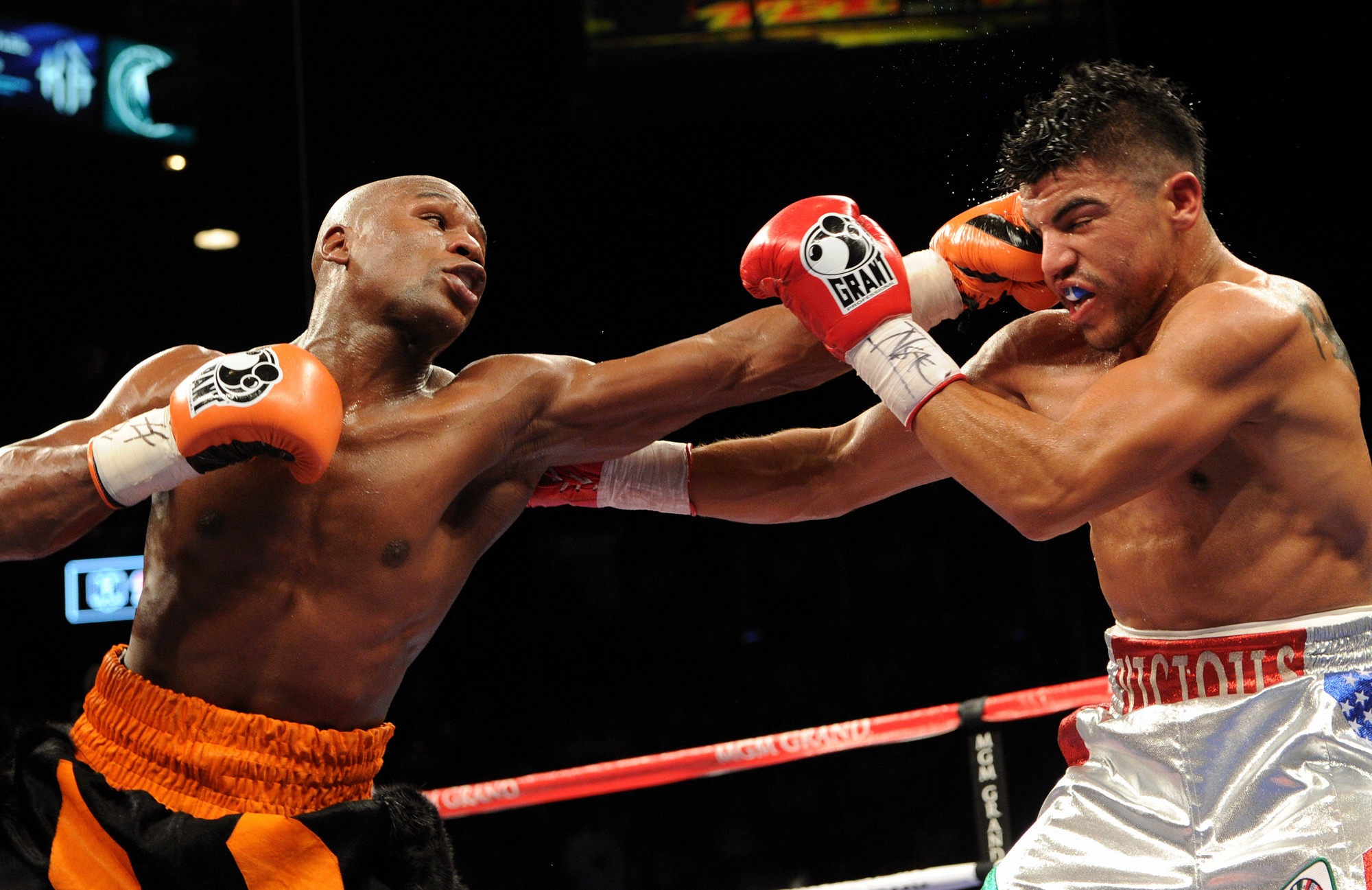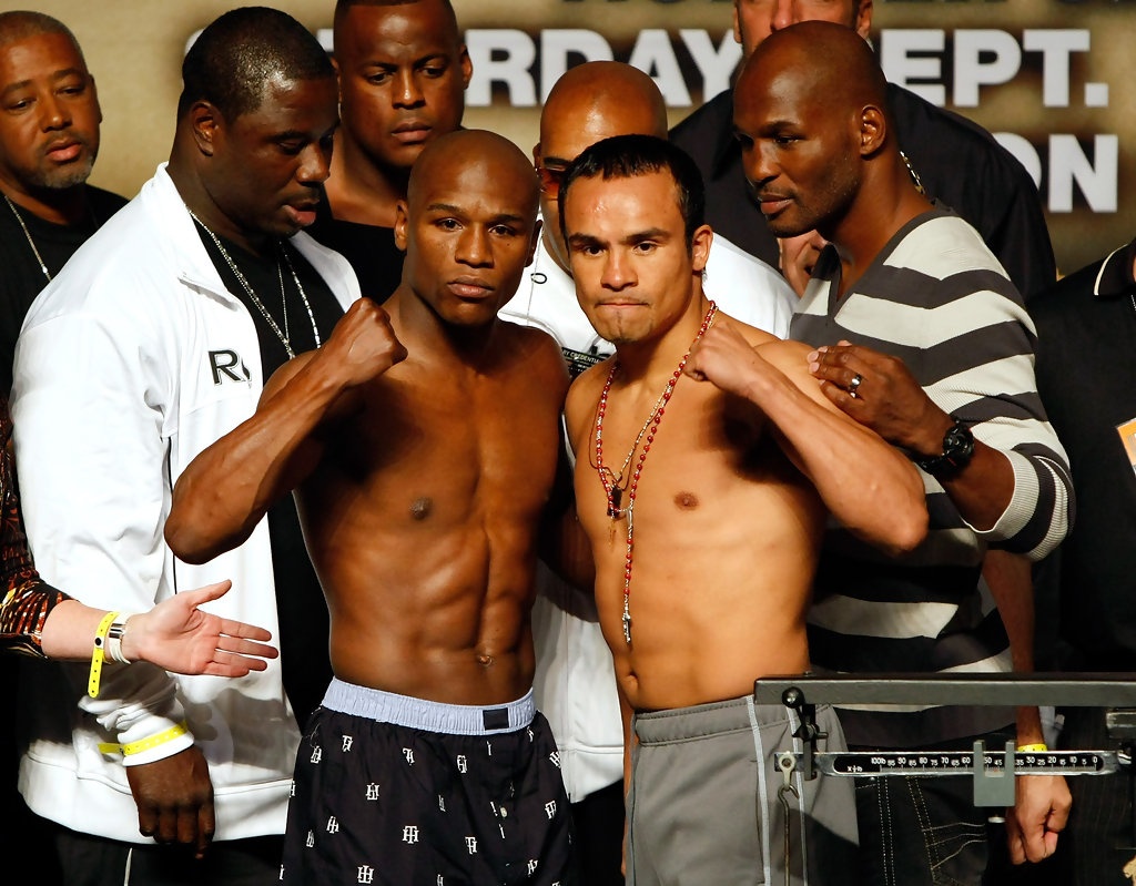 | Tháng 9/2009: Mayweather đánh dấu sự trở lại bằng chiến thắng ấn tượng trước Juan Manuel Marquez. Ảnh: Zimbio. |
