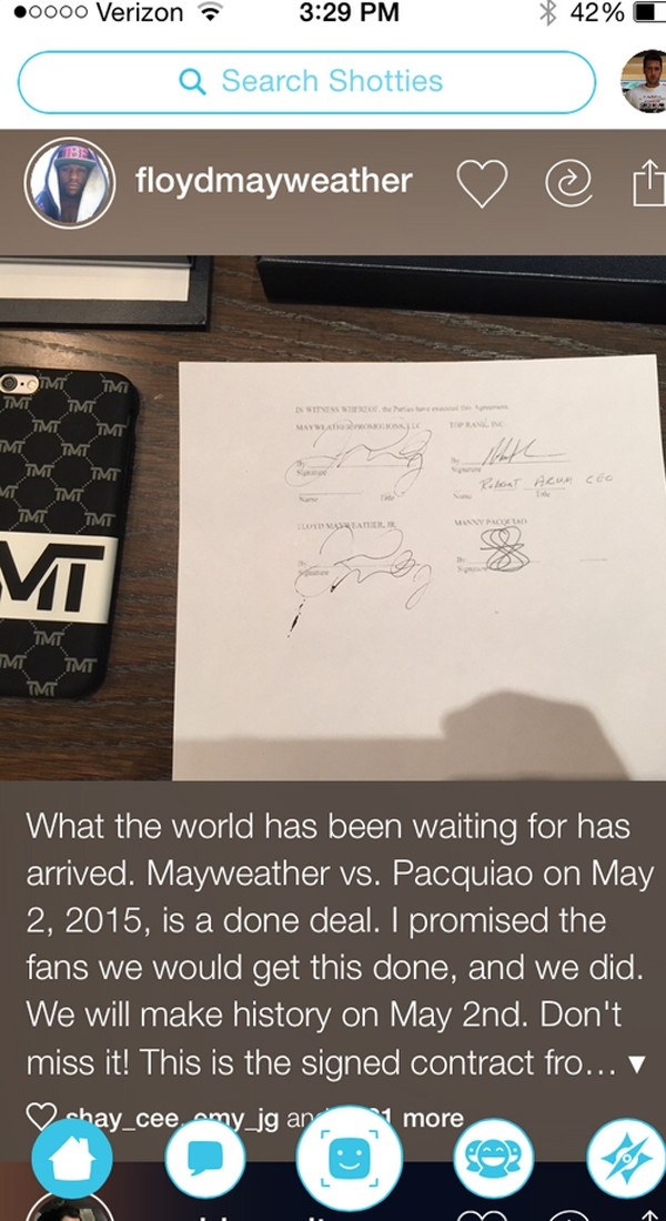 | Tháng 2/2014: Tờ Telegraph tiết lộ, hai tay đấm giàu nhất lịch sử làng quyền anh Mayweather và Pacquiao đã tìm được tiếng nói chung sau nhiều năm tranh cãi. Cùng tháng này, Mayweather công khai bản hợp đồng về cuộc so găng lịch sử với Pacquiao trên mạng xã hội Shots. Ảnh: Telegraph. |