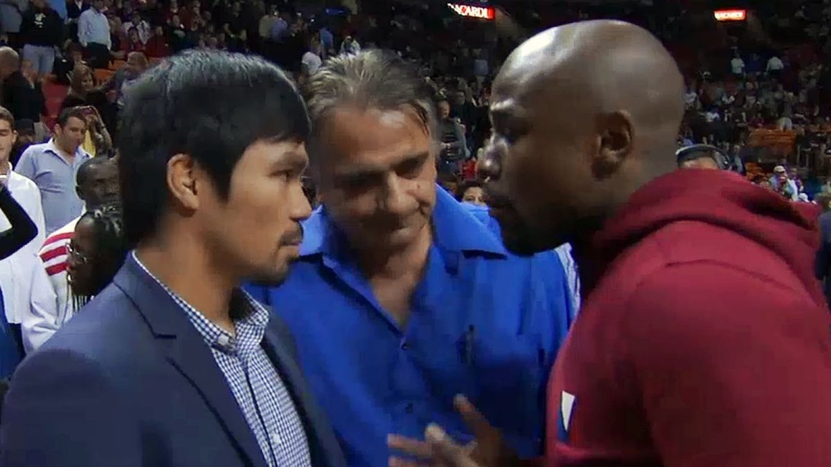 | Tháng 1/2015: Mayweather và Pacquiao lần đầu tiên nói chuyện trực tiếp trong giờ giải lao của trận bóng rổ giữa Milwaukee Bucks và Miami Heat tại Miami. Mayweather cho Pacquiao số điện thoại và họ gặp nhau tại khách sạn của Pacquiao. Ảnh: Foxsports. |