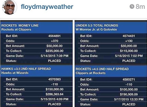 Cụ thể, Mayweather đặt cược tổng số tiền 350.000 USD vào các trận đấu bóng rổ Nhà nghề Mỹ (NBA) giữa Houston Rockets - LA Clippers, Atlanta Hawks - Washington Wizards và cuộc so găng tranh đai vô địch WBA hạng trung giữa Gennady Golovkin - Willie Monroe.