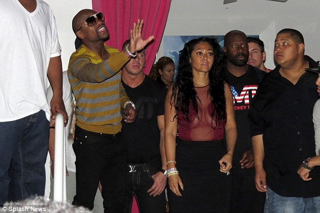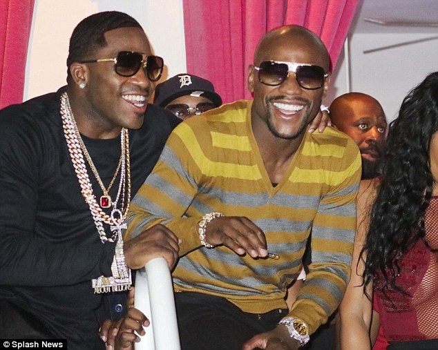 | Mayweather mang theo cả đoàn tùy tùng cùng một túi lớn đựng toàn tiền mặt tới bữa tiệc. |