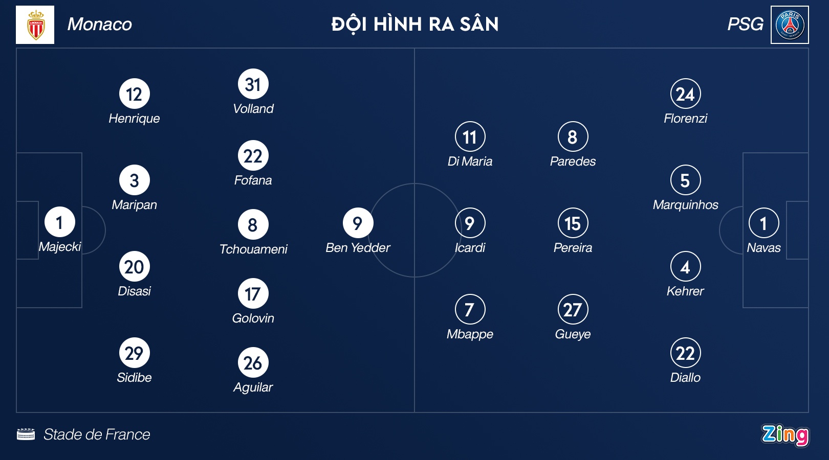 2 CLB mang đến Stade de France đội hình gần như tốt nhất. Bên phía Monaco, HLV Niko Kovac sử dụng đội hình 5 tiền vệ hỗ trợ cho trung phong cắm Wissam Ben Yedder. Trong khi đó, Mauricio Pochettino bố trí sơ đồ 4-3-3. Mbappe chơi bên trái, sát cánh cùng anh là Icardi và Angel Di Maria.