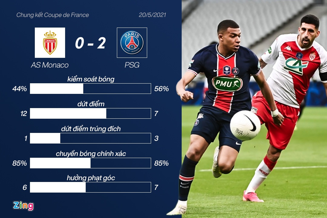 Sau quãng thời gian dài bị đối thủ lấn lướt, PSG dần lấy lại sự chủ động trong khoảng 10 phút cuối. Mbappe vẫn là người xuyên thủng hàng thủ Monaco. Sau cú bấm bóng dội xà ở phút 79, tiền đạo sinh năm 1998 đã có thể ăn mừng với tình huống chạy chỗ, dứt điểm tinh tế ấn định thắng lợi 2-0 cho đội bóng thủ đô.
