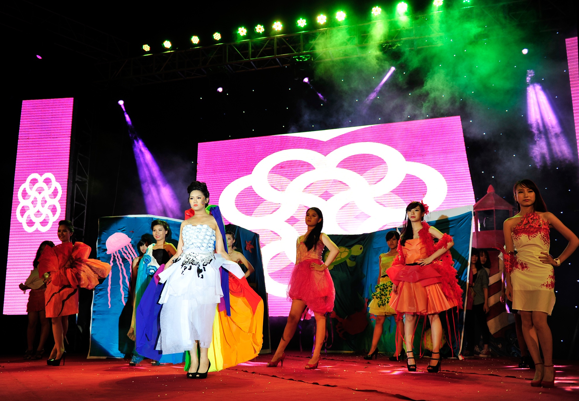 Vedette và các người mẫu trong màn trình diễn dạ hội của khối Văn. Khá nhiều trang phục của các diễn viên được làm từ chất liệu giấy.