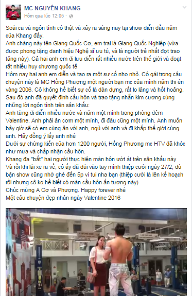 MC Nguyên Khang – người chứng kiến màn cầu hôn lãng mạn chia sẻ thêm: “Tôi và Hồng Phượng, Trấn Thành cùng thi Người dẫn chương trình của HTV năm 2006. Sau cuộc thi, chúng tôi mỗi người mỗi ngả nhưng vẫn giữ mối quan hệ bạn bè. Cuối năm 2015, tôi quen biết anh em Giang Quốc Cơ – Giang Quốc Nghiệp trong đợt trao danh hiệu NSND, NSƯT. Khi dẫn chương trình trong 13/2, Quốc Cơ có đến trao đổi kế hoạch cầu hôn và nhờ tôi hợp tác. Tôi thấy vui khi bạn mình hạnh phúc. Khi tôi chia sẻ câu chuyện lên facebook, các đồng nghiệp ai nấy đều vui lây. Chúng tôi đã hẹn nhau ngày 27/2 sẽ cùng đi đám cưới Hồng Phượng”.