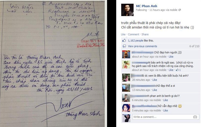 Tối qua, Phan Anh chia sẻ trên trang cá nhân bản cam kết có dấu đóng của bác sĩ nơi anh nhập viện khiến nhiều người hâm mộ lo lắng cho sức khỏe của anh. Tuy nhiên, nam MC cho biết, anh chỉ phẫu thuật amidan, xác suất xảy ra rủi ro hay biến chứng rất thấp.
