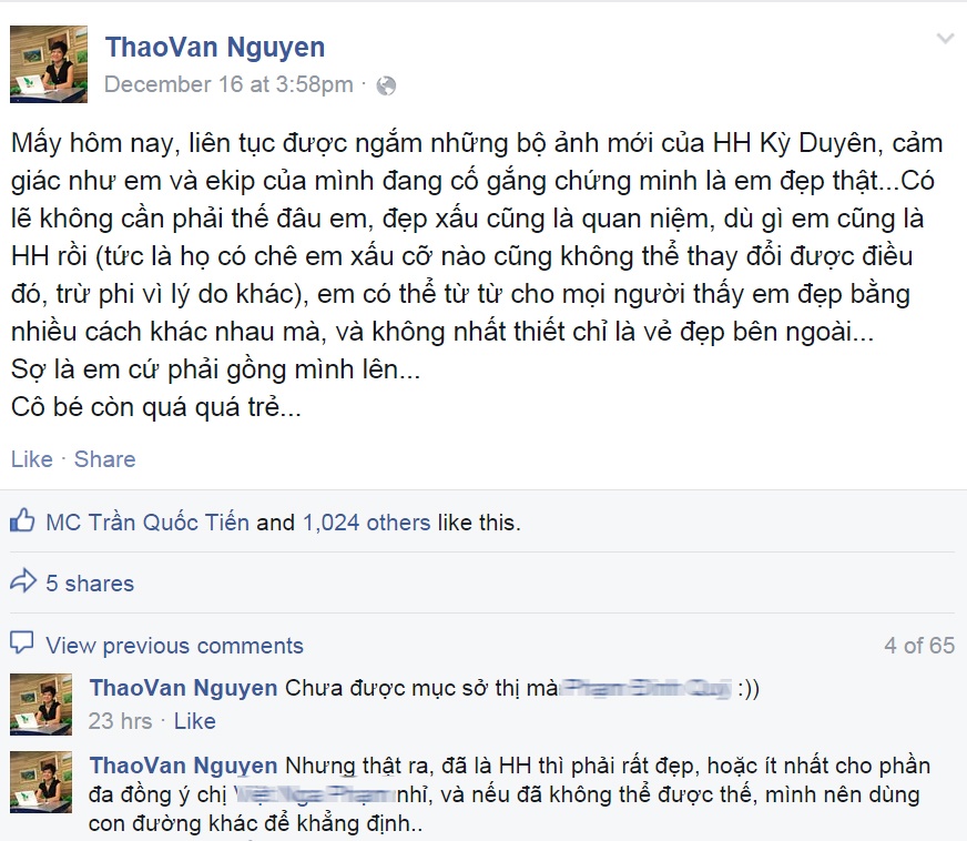 Trên trang cá nhân, MC Thảo Vân chia sẻ cảm xúc của mình khi thấy những bộ ảnh mới của tân Hoa hậu Kỳ Duyên được đăng tải liên tục trong những ngày qua: "Cảm giác như em và ê-kíp của mình đang cố gắng chứng minh là em đẹp thật. Có lẽ không cần phải thế đâu em, đẹp xấu cũng là quan niệm, dù gì em cũng là Hoa hậu rồi (tức là họ có chê em xấu cỡ nào cũng không thể thay đổi được điều đó, trừ phi vì lý do khác), em có thể từ từ cho mọi người thấy em đẹp bằng nhiều cách khác nhau mà, không nhất thiết chỉ là vẻ đẹp bên ngoài. Sợ là em cứ phải gồng mình lên... Cô bé còn quá quá trẻ".