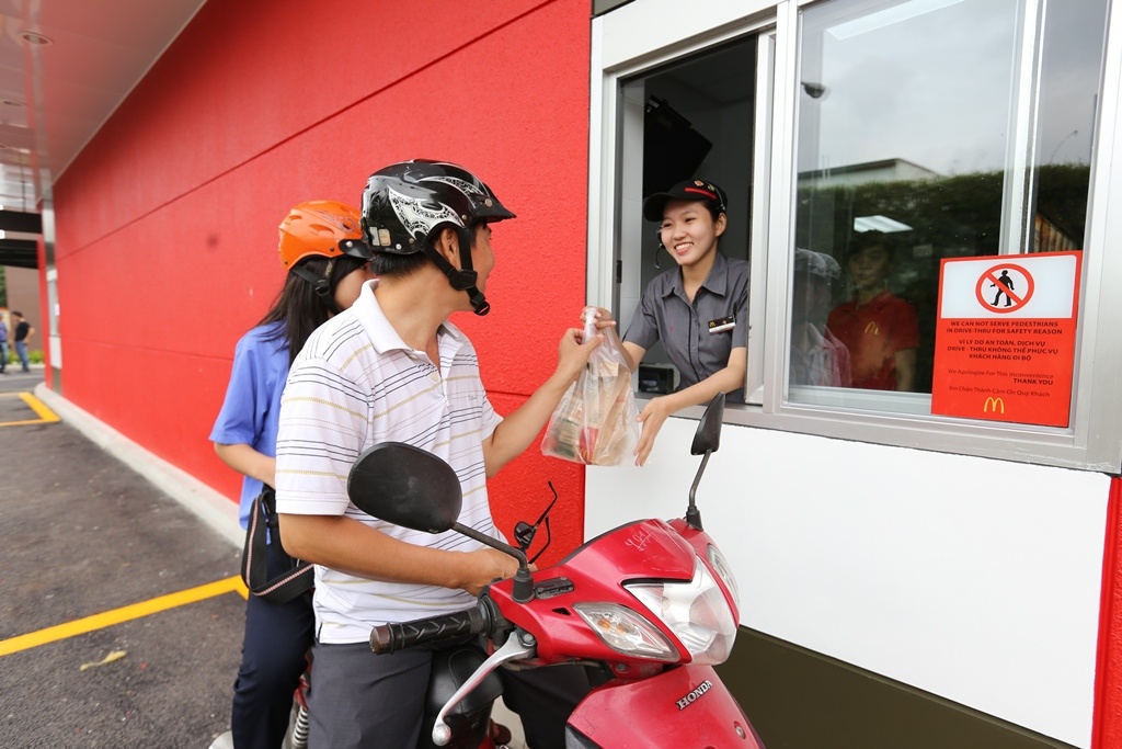 | McDonald’s còn có dịch vụ drive-thru (mua hàng không cần đỗ xe) lần đầu tiên xuất hiện tại Việt Nam. Xe chạy từ cổng chính vào khu vực Drive-thru và gọi món qua màn hình LCD. |