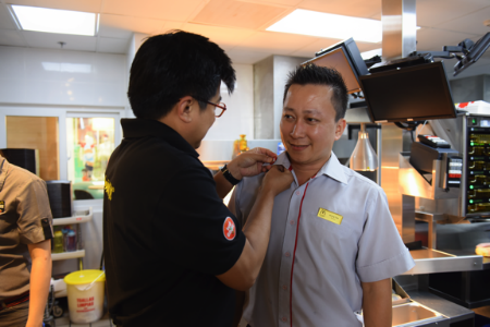 Ông Bảo Hoàng trao tặng huy hiệu cho ông Kenny, trưởng nhà hàng McDonald’s Vincom Masteri. |