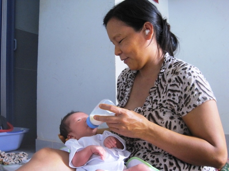 | Bé Hoài đang được mẹ cho uống sữa tại phòng trọ. |