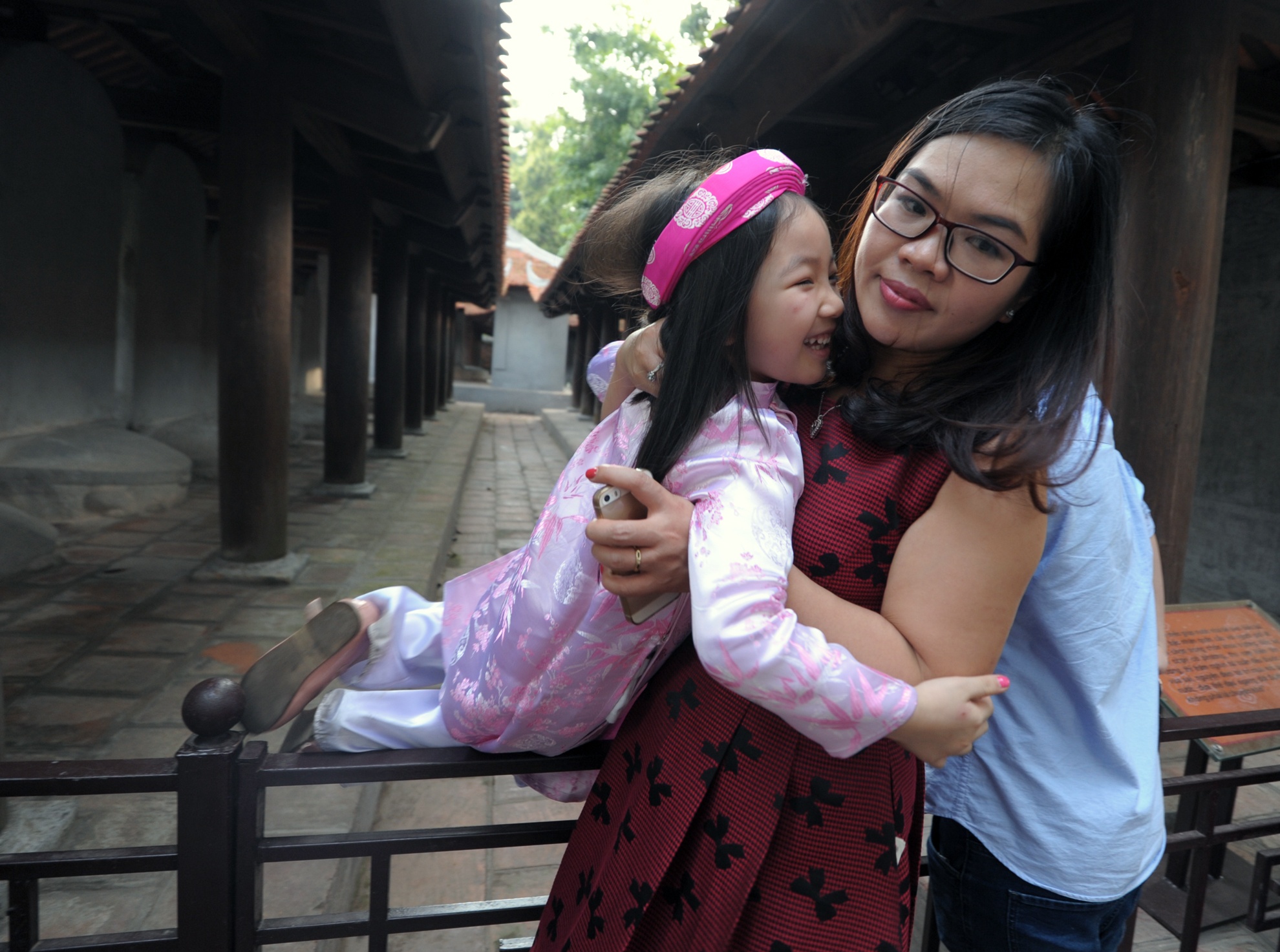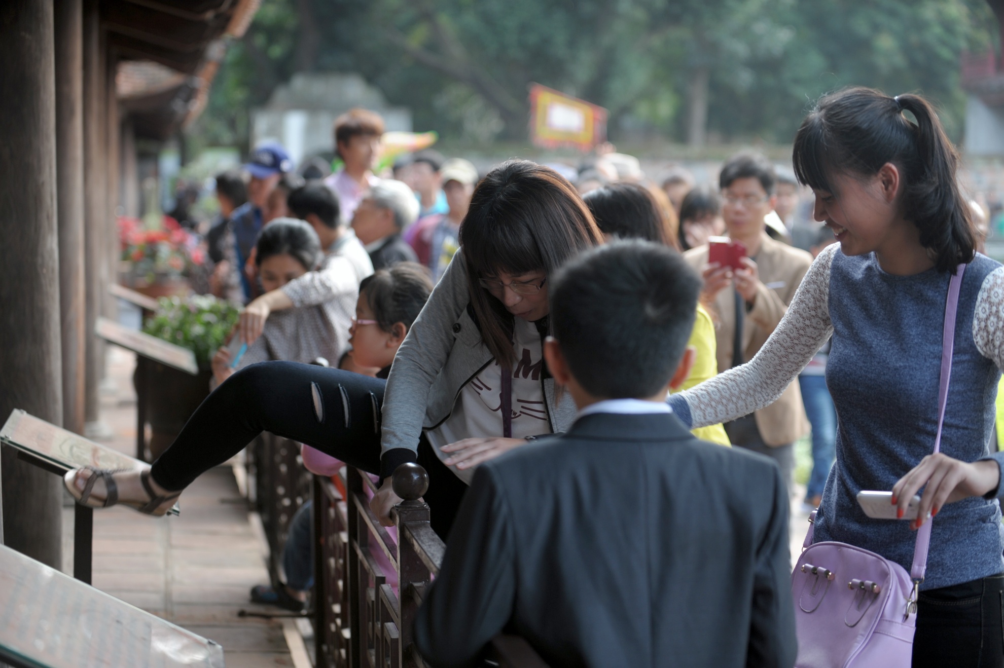 Mẹ chỉ đạo con trèo rào sờ đầu rùa cầu may ngày Tết