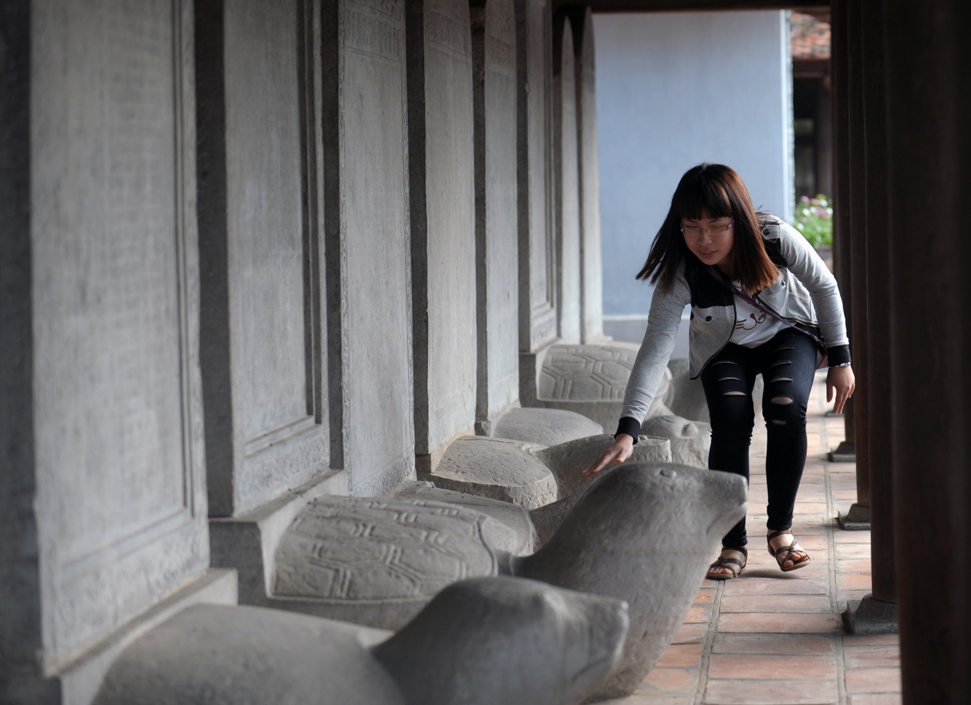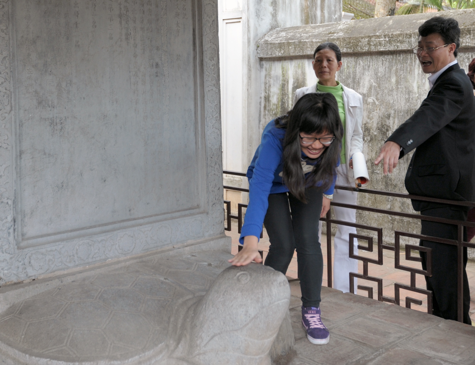| Không chỉ các bạn trẻ mà nhiều phụ huynh cũng có quan niệm sờ được đầu rùa đầu năm sẽ gặp may trên con đường học vấn. Một phụ nữ sau khi không động viên được con gái mình liền trèo rào vào làm trước. |