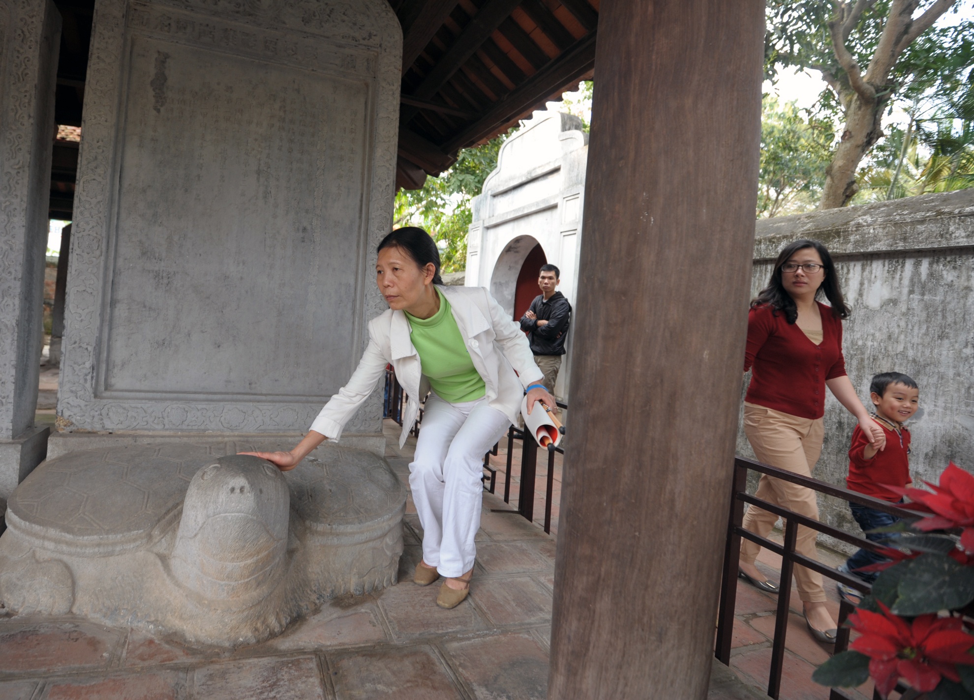 Một người, hai người rồi ba người, thậm chí nửa gia đình thay nhau trèo rào vào khu vực cấm tại Văn Miếu (Hà Nội) sờ đầu rùa cầu may đầu năm.