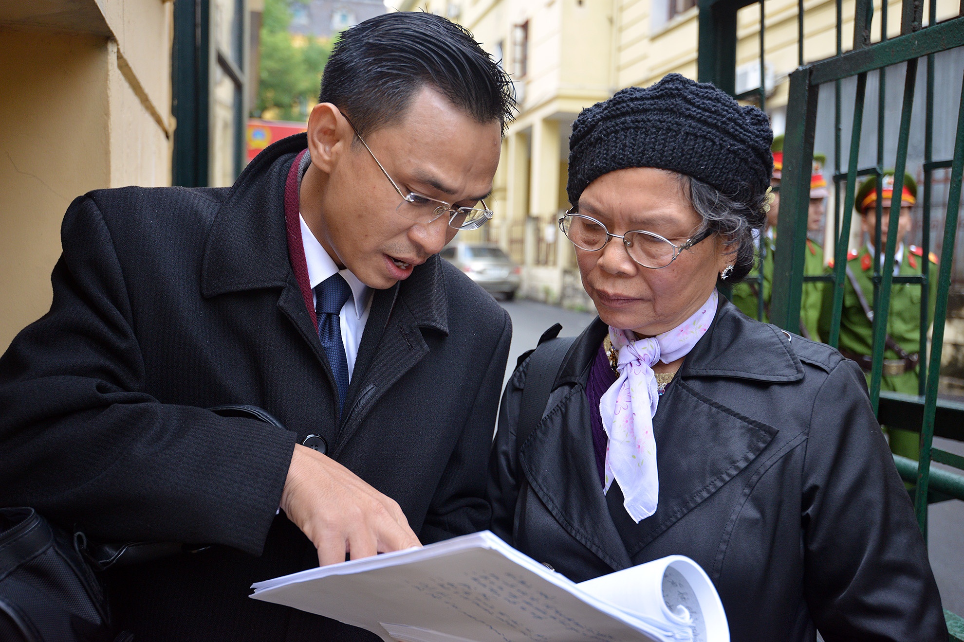 | Bà Hiền - mẹ nạn nhân Lê Thị Thanh Huyền, cùng luật sư trao đổi ngoài sân tòa từ khá sớm. |