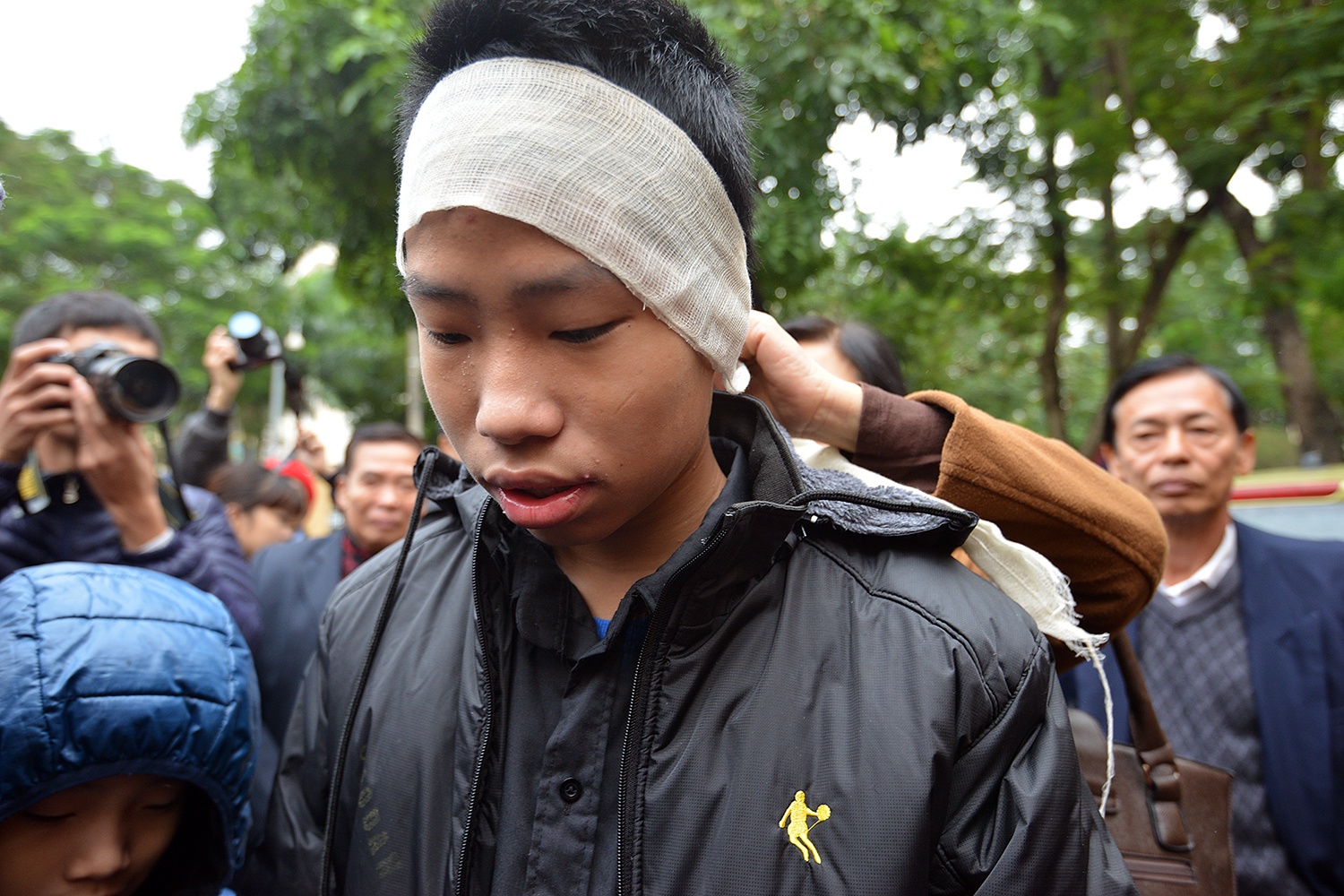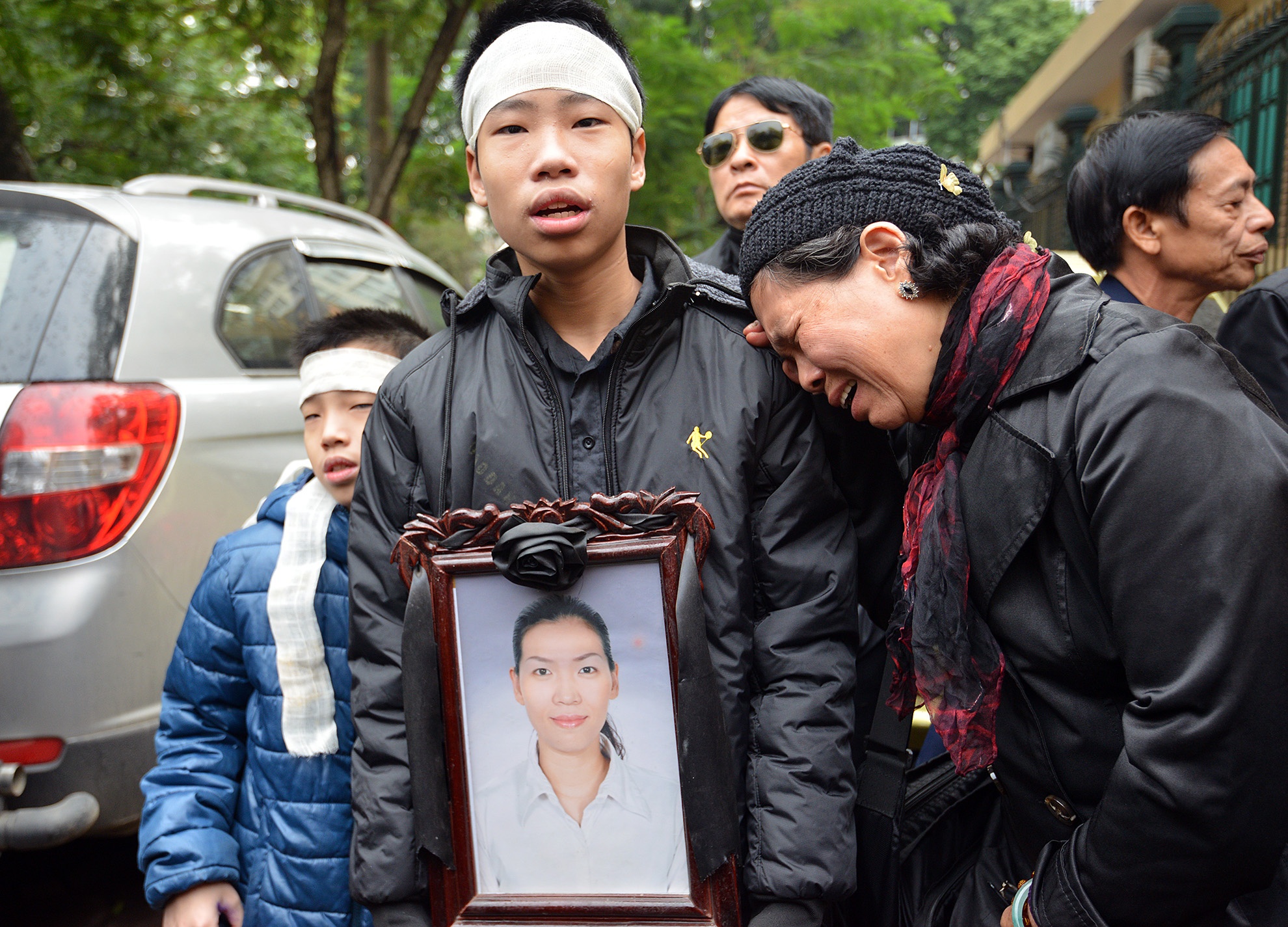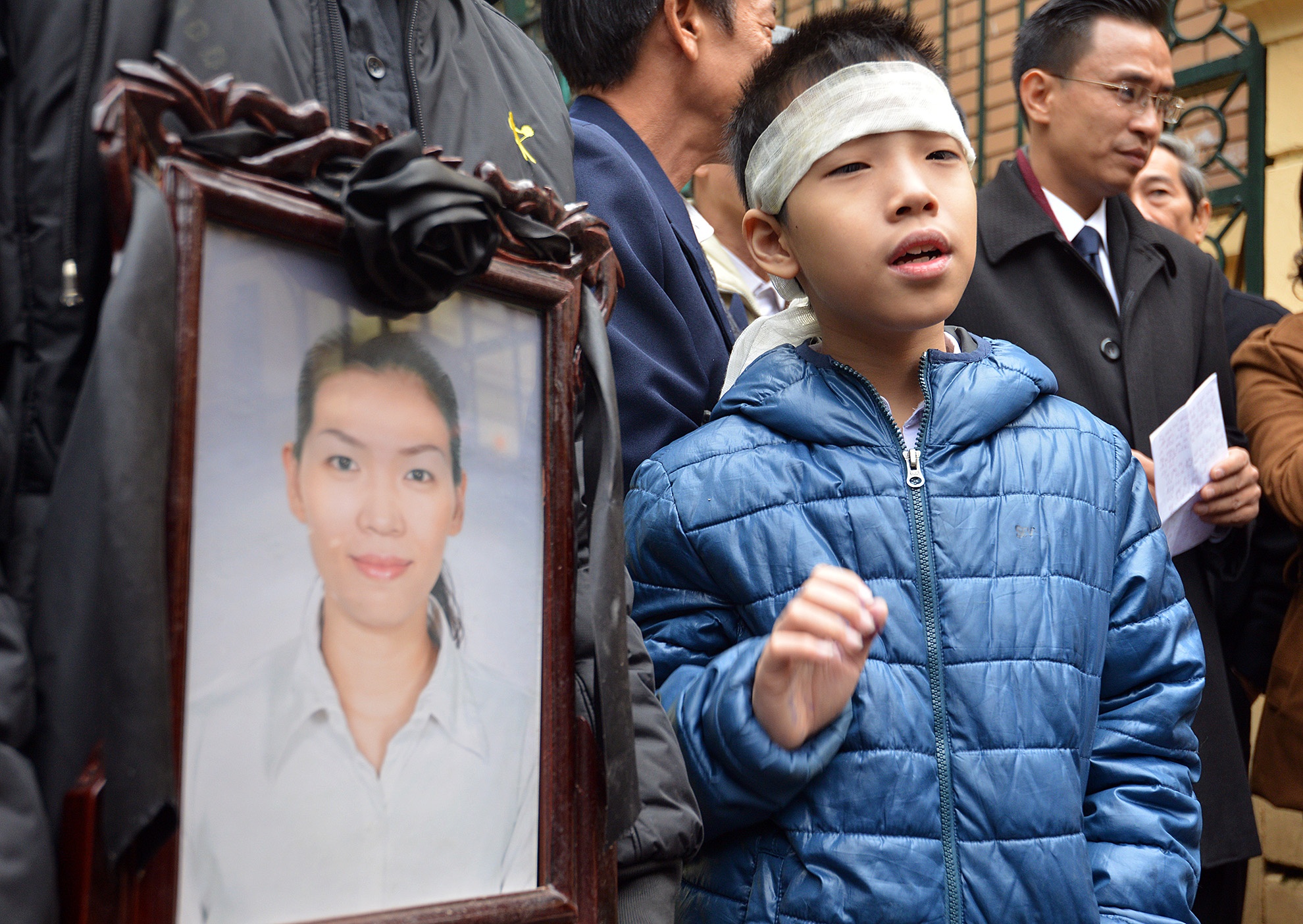 | Hai con trai chị Huyền đến dự tòa cùng bố, đầu chít khăn tang, tay cầm di ảnh mẹ. |