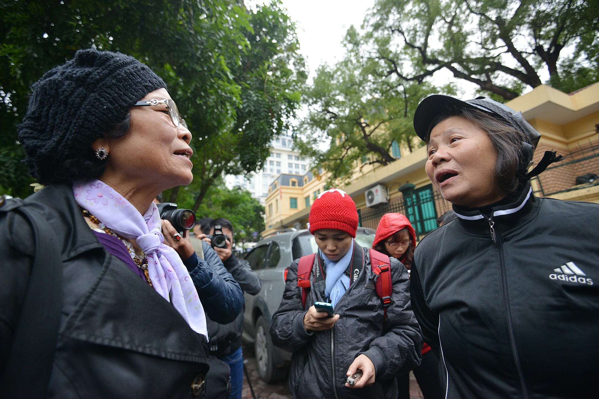 | Khi đứng đợi ngoài cổng tòa, bà Hiền có nói chuyện với người nhà bị cáo Đào Quang Khánh. |