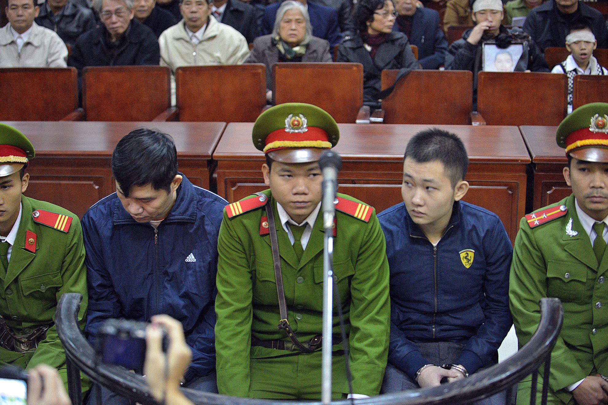 | 8h30, bị cáo Nguyễn Mạnh Tường và Đào Quang Khánh được dẫn vào phòng xử. Ngồi hàng ghế phía sau là người thân chị Huyền. |