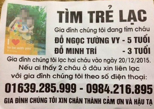 Những ngày sau Tết Nguyên đán 2016, cư dân mạng liên tục chia sẻ tin tìm 2 trẻ lạc. Nạn nhân là hai bé Đỗ Ngọc Tường Vy (5 tuổi) và bé Đỗ Minh Trí (3 tuổi).