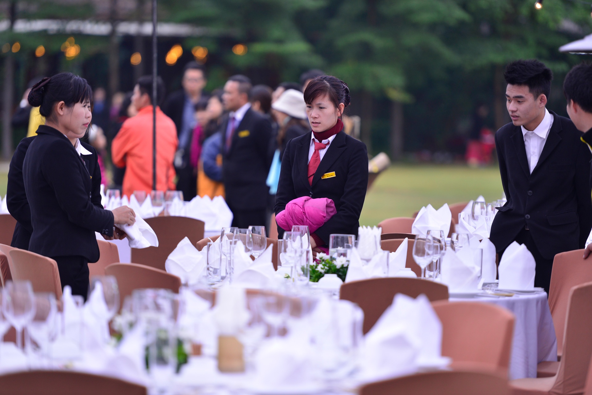 | Khoảng 16h, khi những vị khách đầu tiên có mặt, các công đoạn chuẩn bị cuối cùng của tiệc cưới đang được hoàn tất. |