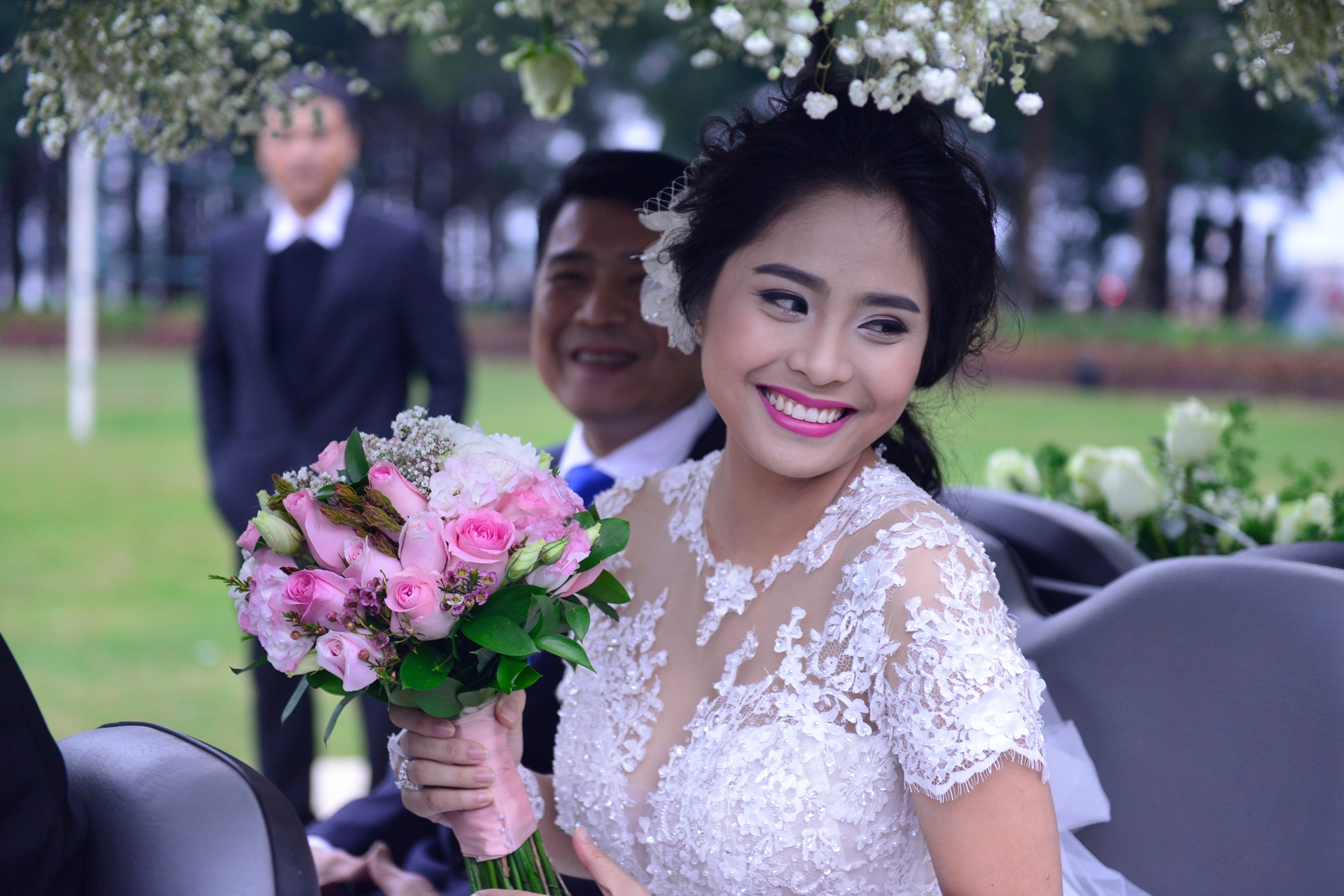 | Kiều Anh được bố cầm tay tiến vào hôn trường. Cô rạng rỡ đứng trước mặt chú rể. |