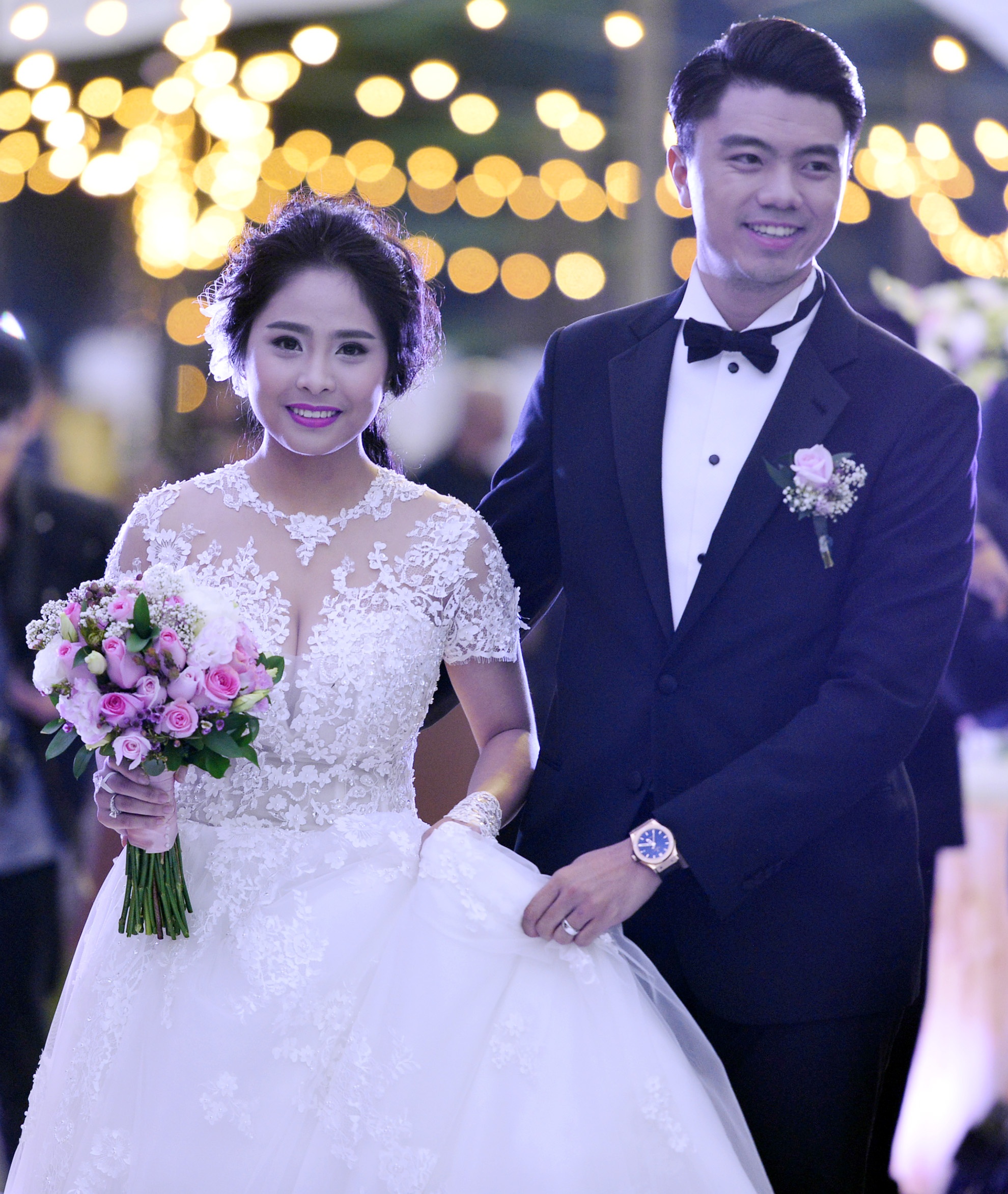 | Cả hai cùng cười hạnh phúc nắm tay nhau đi vào khu tổ chức lễ cưới. Văn Quỳnh rất ga-lăng khi giúp Kiều Anh nâng váy và chủ động dìu cô khi di chuyển. |
