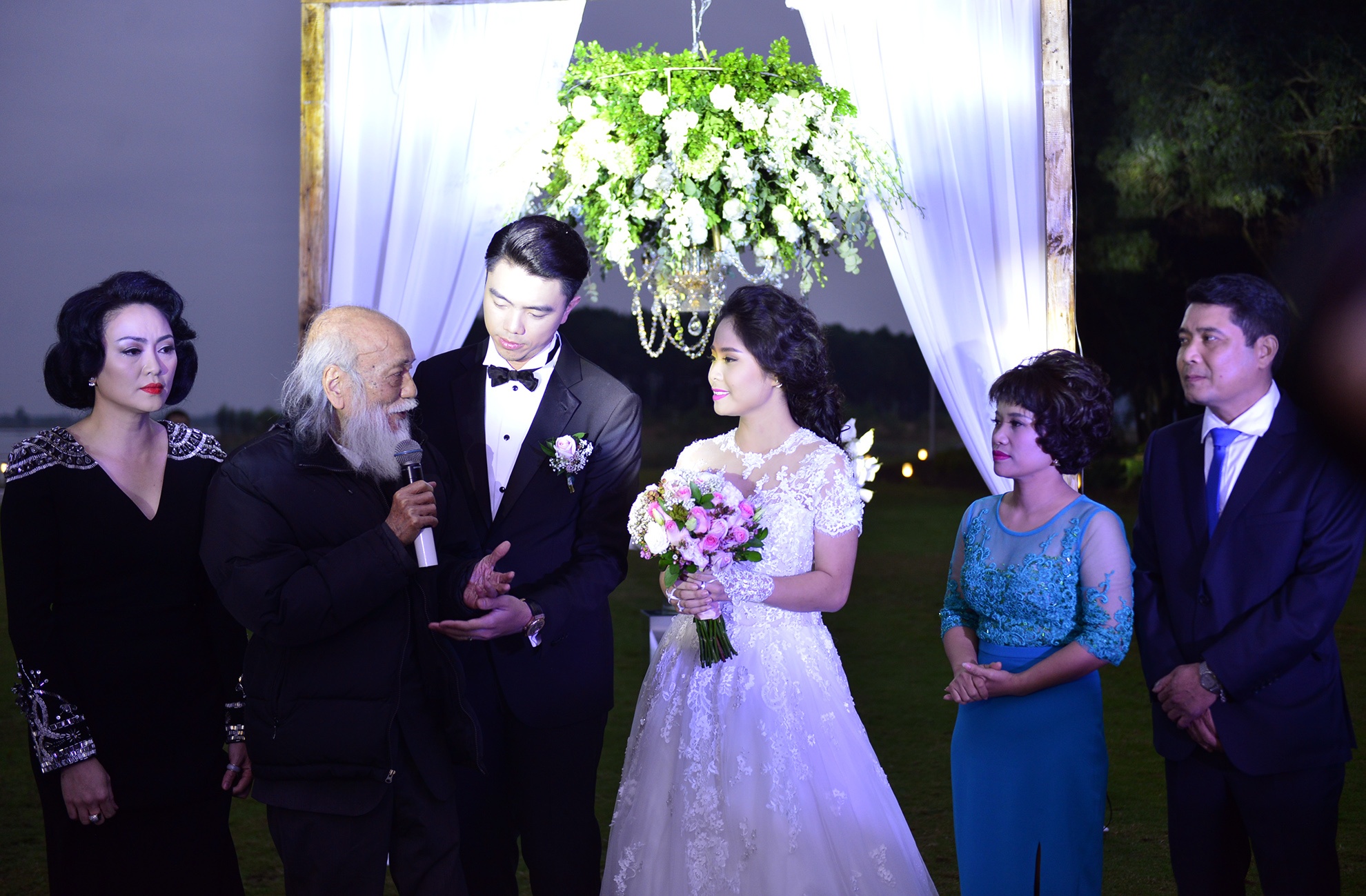 | Cả hai cũng trao nhau nụ hôn hạnh phúc trước sự chứng kiến của hàng trăm quan khách. Trước đó, Văn Quỳnh và Kiều Anh cũng trao nhau lời thề ước hôn nhân. Cháu ngoại PGS Văn Như Cương hứa sẽ nỗ lực bảo vệ và đem tới hạnh phúc cho ca nương 9X. |