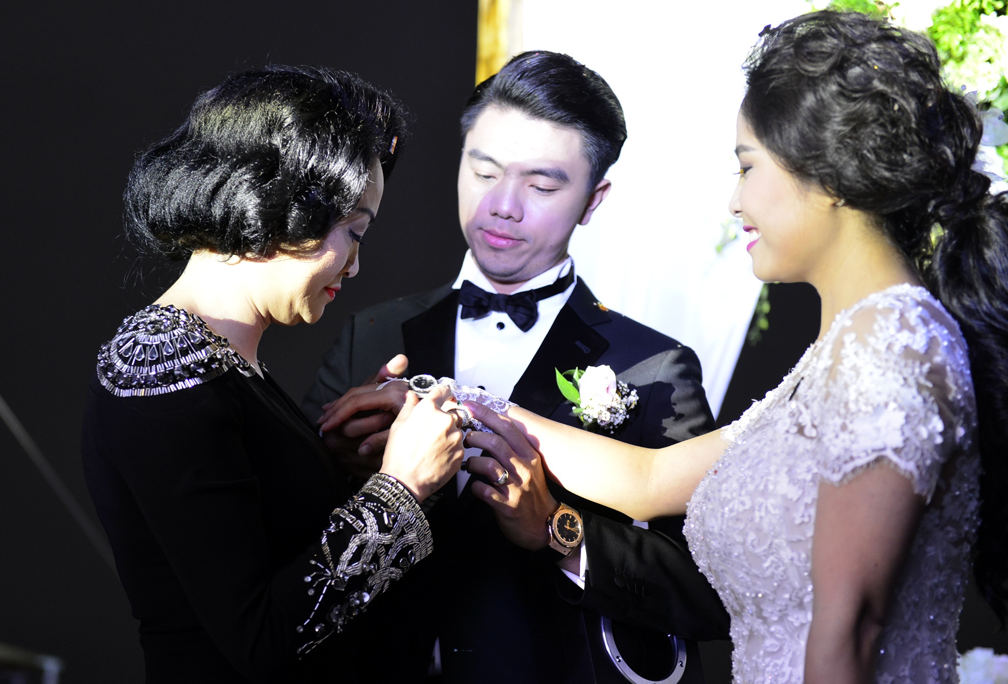 | Mẹ chủ rể trao quà cho cô dâu. Không chọn những món quà truyền thống như vòng hay nhẫn vàng, bà Văn Thùy Dương tặng cho Kiều Anh chiếc đồng hồ khá đắt tiền để nhắc nhở con dâu về ý nghĩa của thời gian để không phải hối tiếc về khoảng khắc nào trong cuộc sống. |