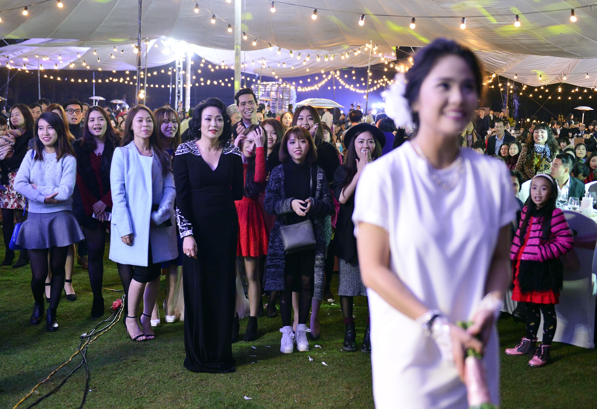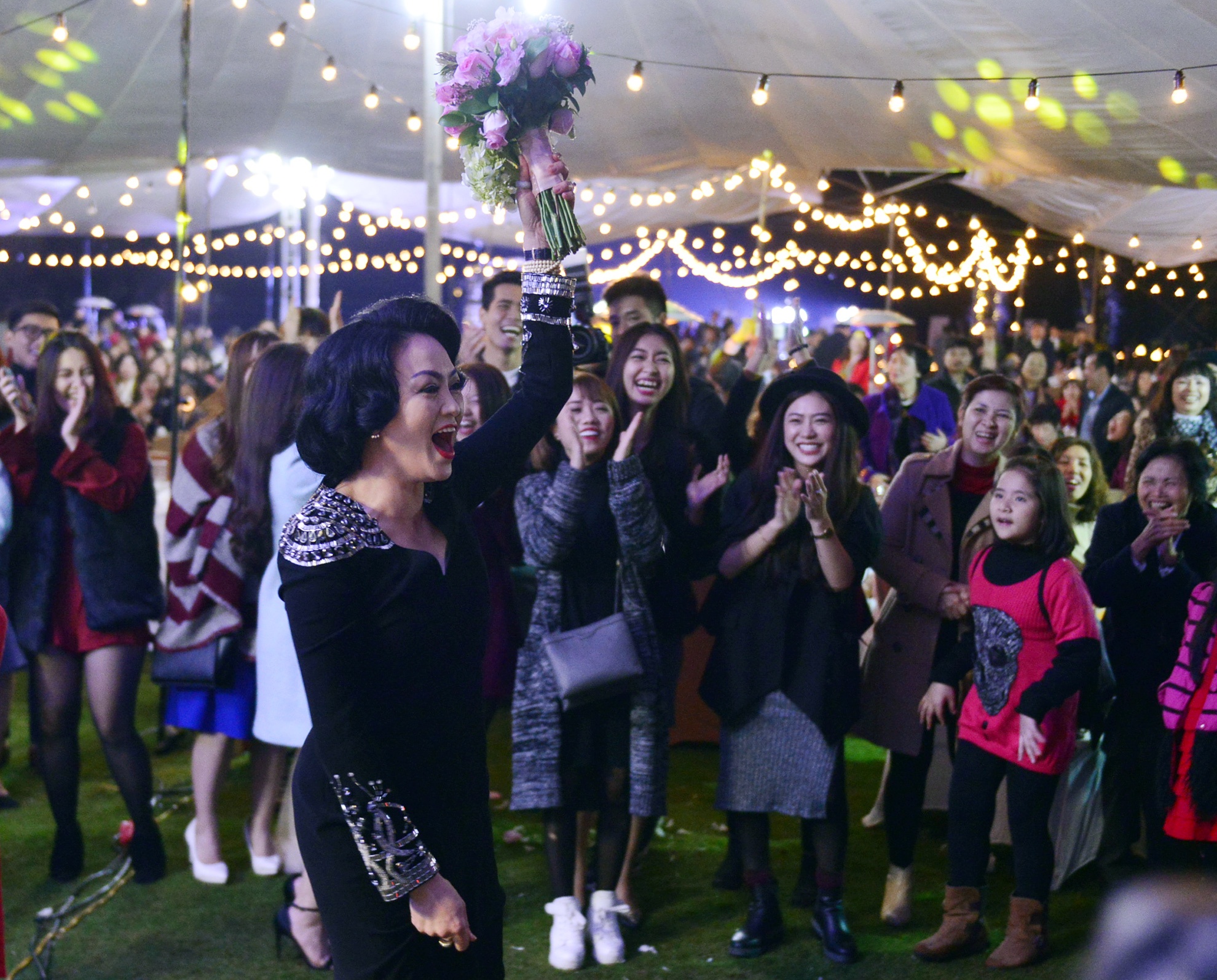 | Sau khi hoàn thành các nghi lễ cưới hỏi, Kiều Anh thay váy và chuẩn bị tung hoa cưới cho các cô bạn và chị em chưa kết hôn. Mẹ chồng cô cũng tham gia tranh hoa cưới để khuấy động không khí. |
