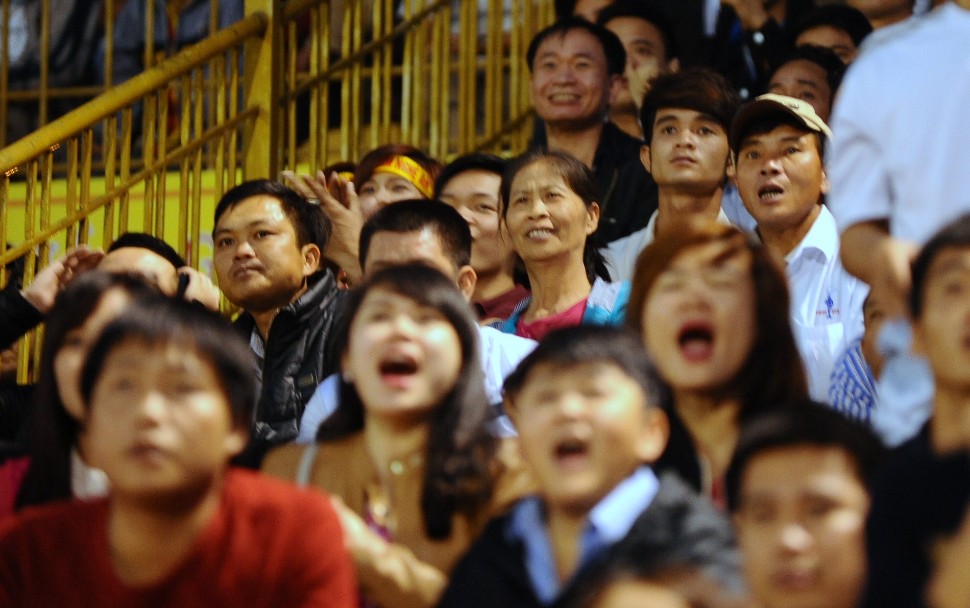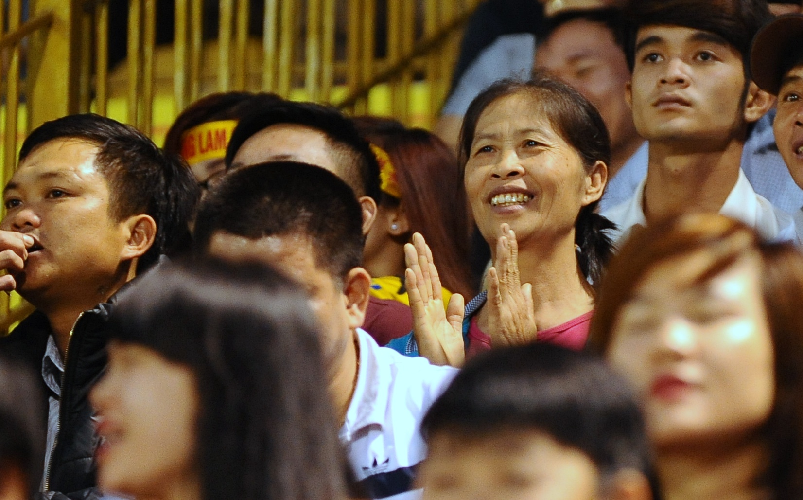 | Bà Nguyễn Thị Hoa nheo mày trong khi các CĐV Nghệ An ăn mừng bàn thắng của Mạnh Hùng vào lưới HAGL. |