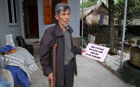 Tay cầm chiếc nạng gỗ, ông Tam cố lê bước chân thương tật đi lên bậc thềm, đứng dưới tấm biển “Nhà tình thương do công ty Thiên Cầm tặng”, vừa chỉ tay về tấm biển, ông Tam rưng rưng: “Lời hứa của nhà đầu tư chỉ là tấm biển và biểu trưng ngày có lãnh đạo tỉnh về trao. Giờ không biết tìm họ ở đâu mà đòi tiền”.