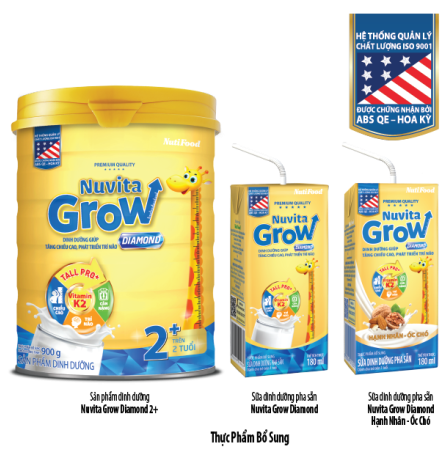Nuvita Grow Diamond là dòng sản phẩm cao cấp của NutiFood, với công thức đặc chế Tall Pro+ là sự kết hợp tỷ lệ cân đối của bộ 3 dưỡng chất: Nano canxi, vitamin D3 và đặc biệt bổ sung vitamin K2. Sản phẩm được thiết kế phù hợp với thể trạng của trẻ em Việt Nam, hàm lượng các vitamin và khoáng chất đáp ứng 100% nhu cầu khuyến nghị của WHO, giúp trẻ phát triển chiều cao tốt hơn. Ngoài ra, Nuvita Grow Diamond còn giúp hỗ trợ hoàn thiện não bộ, giúp tăng cân, tăng cường sức đề kháng và ngăn ngừa táo bón nhờ công thức bổ sung DHA, lutein, taurin, cholin, sắt, kẽm, vitamin A, E, C, chất xơ…