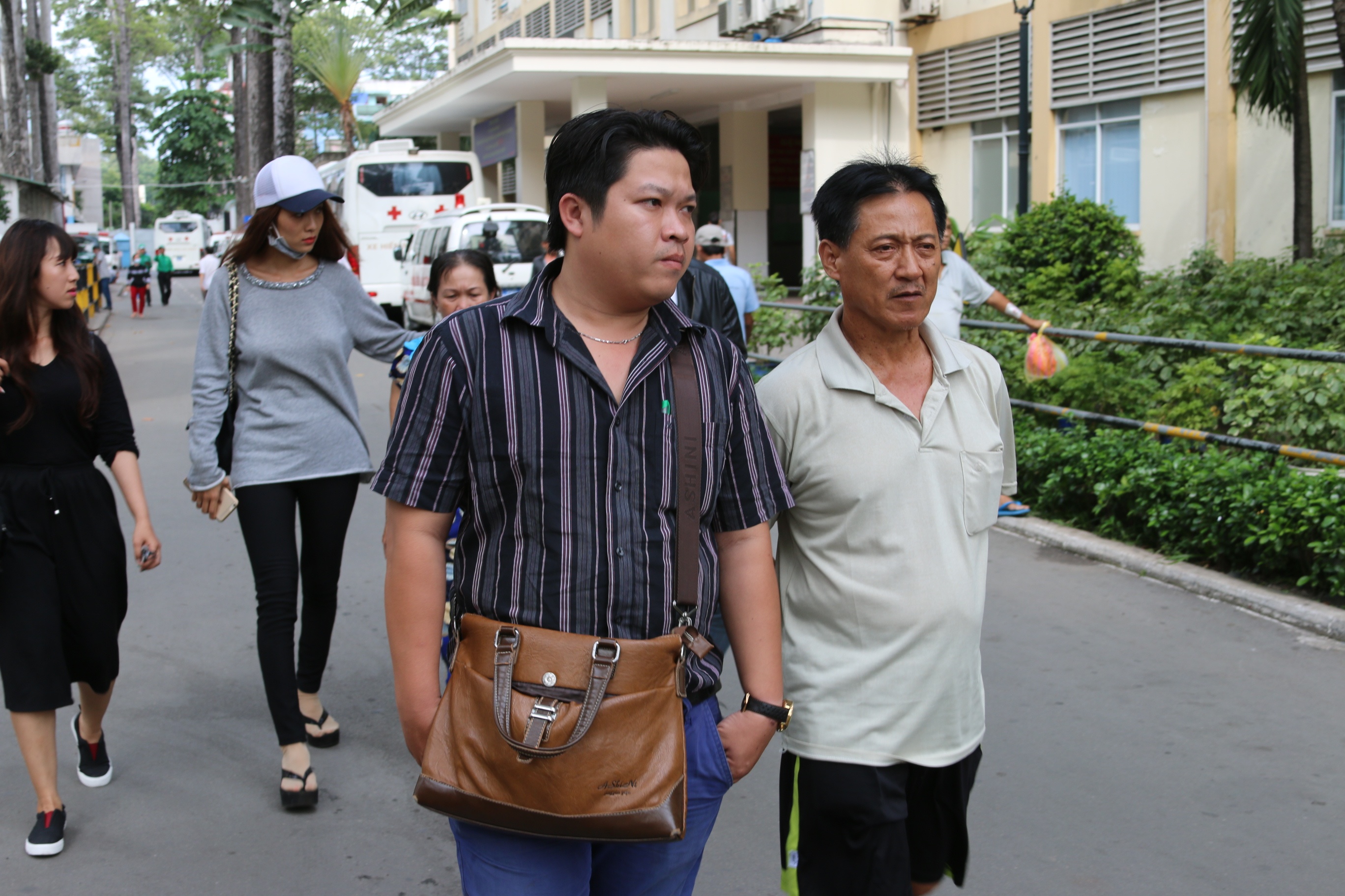 | Mẹ Nguyễn Giàu trò chuyện cùng Ưng Hoàng Phúc và Kim Cương ngoài cổng bệnh viện, nơi chữa trị cho Giàu. Ảnh: Khắc Bình |