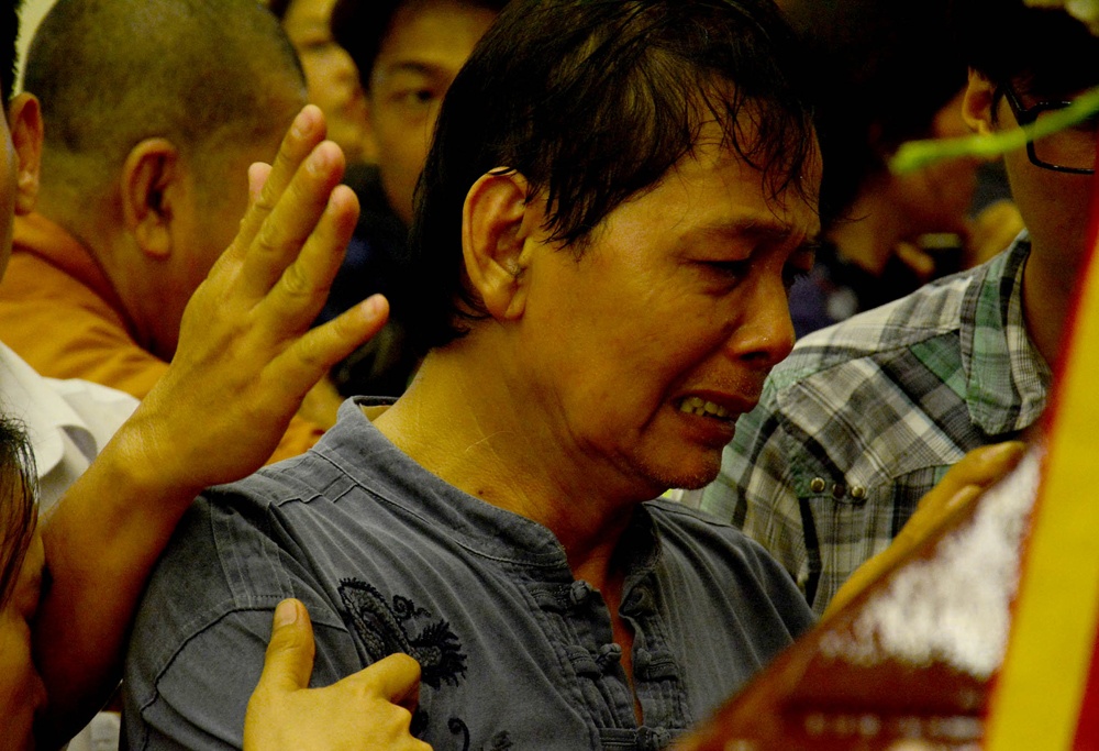 | Dù cố gắng kìm nén nhưng bố nam diễn viên đoản mệnh không giấu được dòng nước mắt đau thương. Ông ôm chặt quan tài con trai. |