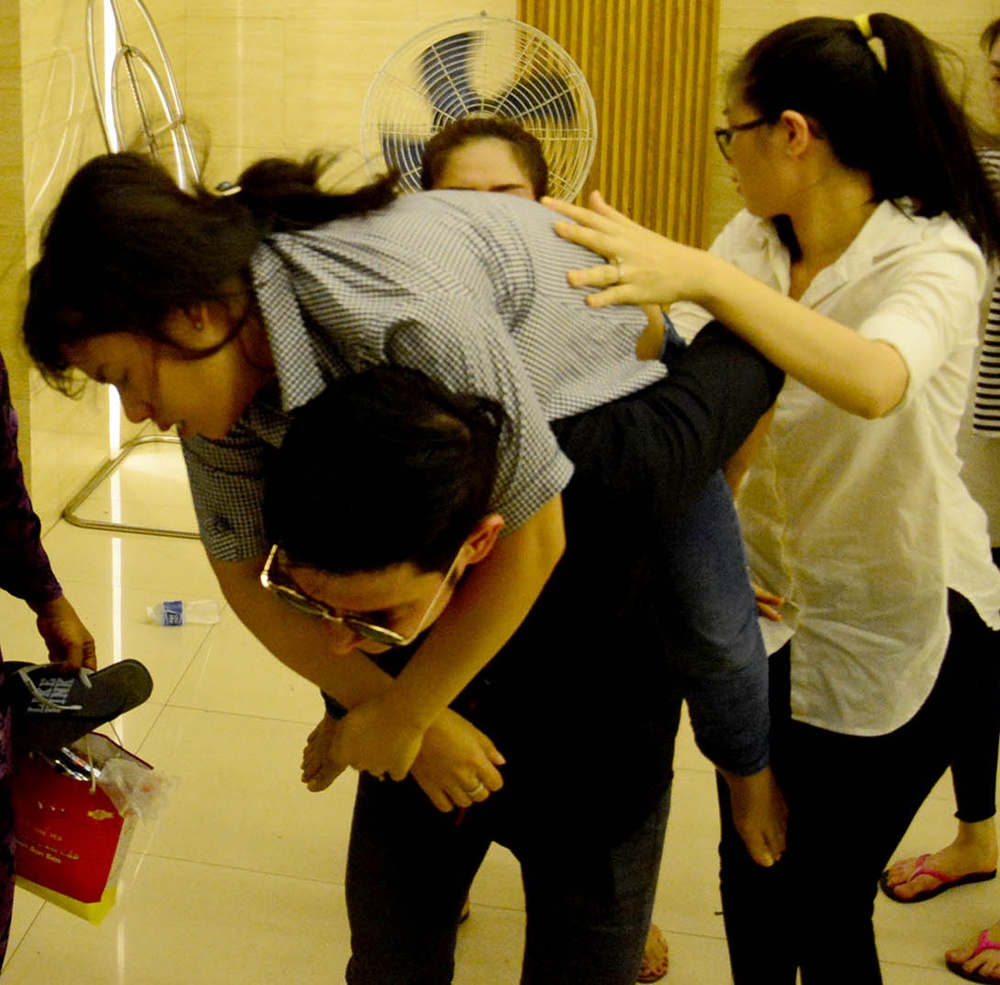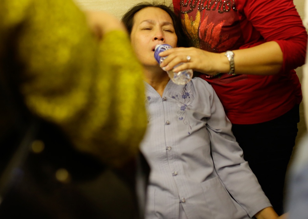 Chị gái thứ hai của Duy Nhân (áo đỏ) ôm ngực nghẹn ngào. Chị cũng là người thay mẹ đứng ra lo lắng đám tang em trai những ngày qua.