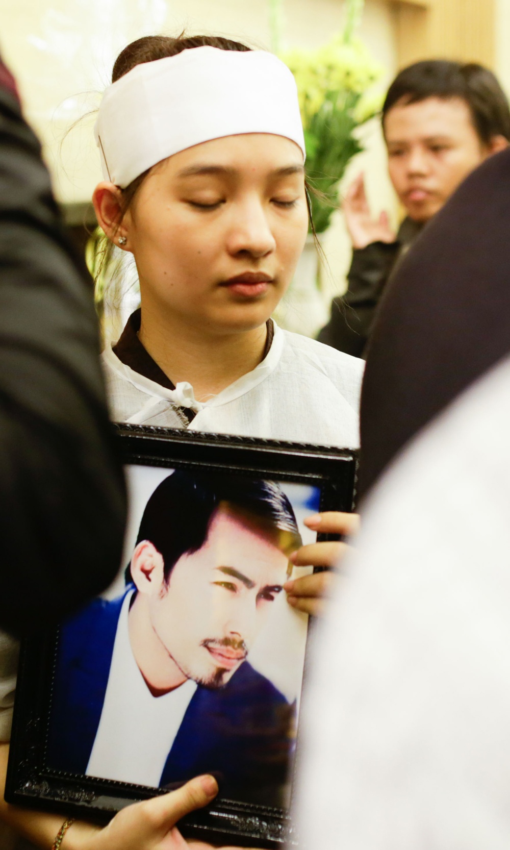 | Kiều Oanh ôm di ảnh chồng vào lòng. Cô cố nén thương đau trong tang lễ. |