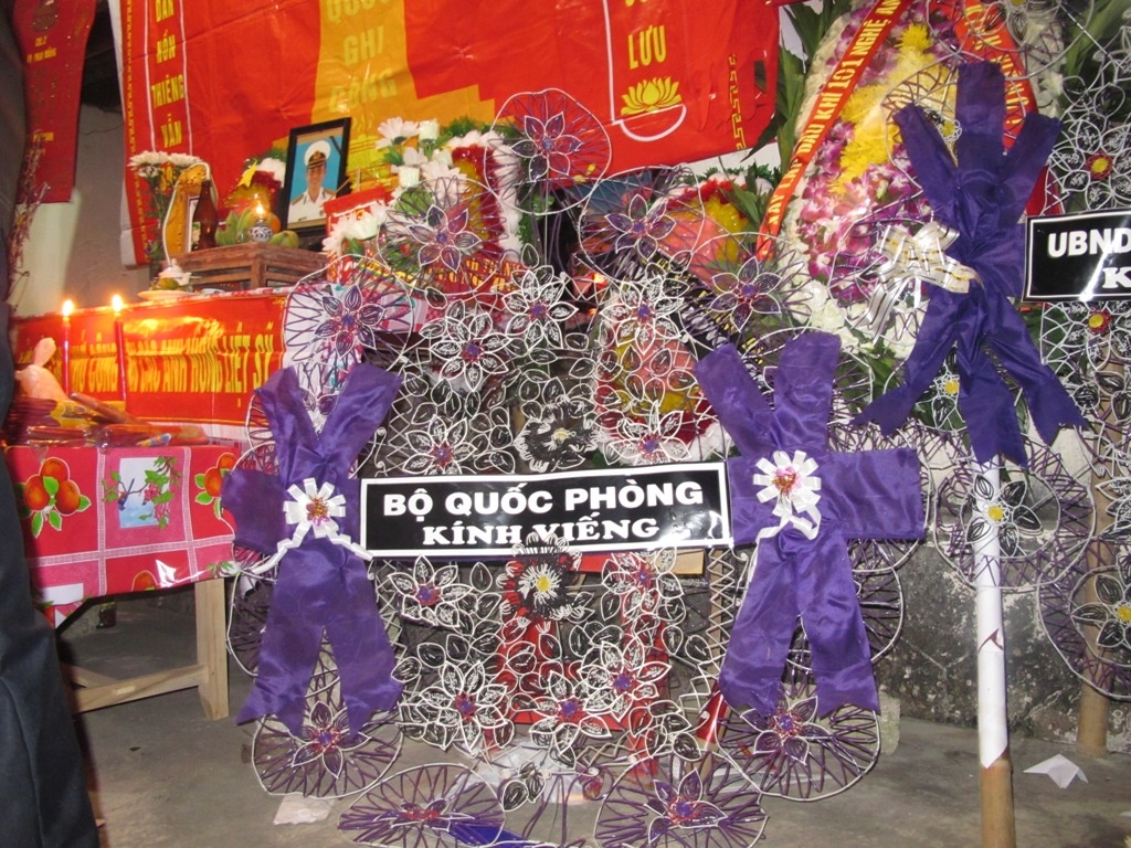 | Vòng hoa của các cơ quan đơn vị tràn ngập xung quanh bàn thờ trung úy Hạnh. Ngày 23/1, lễ an táng anh Hạnh sẽ được chính quyền tổ chức trọng thể tại quê nhà, nơi anh sinh ra. |