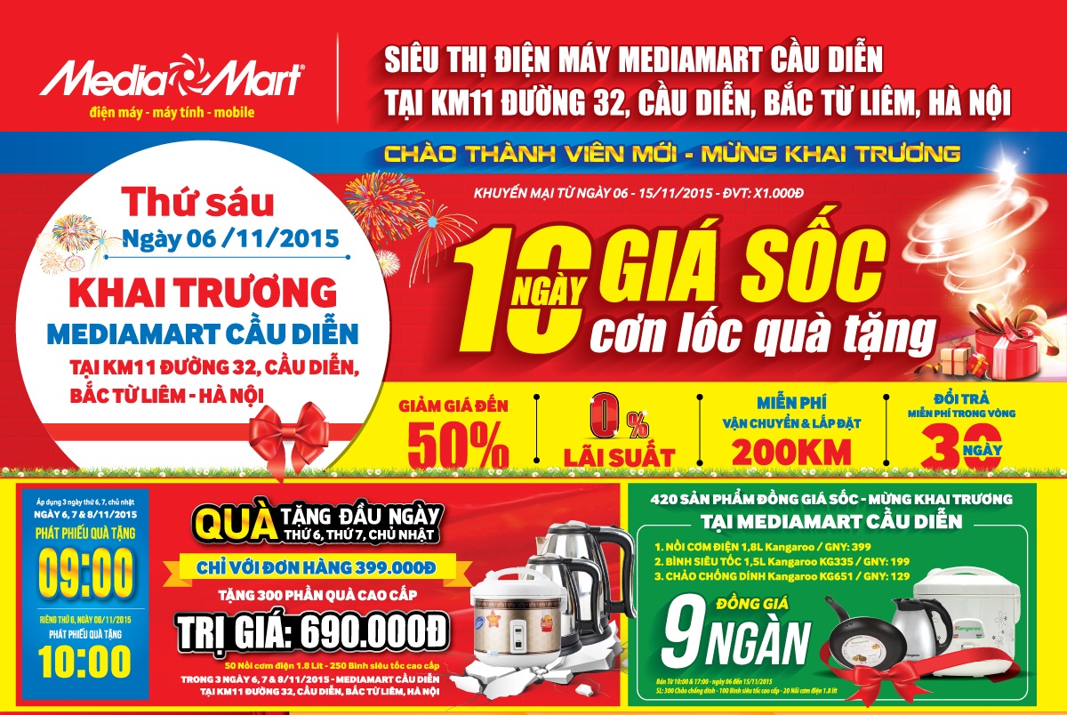 Đón đầu tháng khuyến mại Hà Nội 2015, sự góp mặt của Media Mart Cầu Diễn với loạt chương trình khuyến mại rầm rộ áp dụng trên toàn hệ thống và kéo dài hết tháng 11 sẽ góp phần bình ổn giá cả, đáp ứng nhu cầu, nâng cao chất lượng cuộc sống của người dân trong tháng vàng mua sắm này.