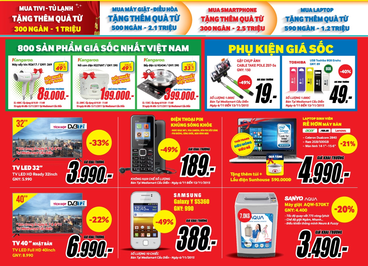 Ngoài ra, Media Mart còn giảm giá hàng loạt mặt hàng trong đợt khai trương này như TV LED 32 inch, giảm trực tiếp 1,5 triệu đồng chỉ còn 3,99 triệu đồng; TV LED FULL HD 40 inch Sharp giá chỉ còn 6,99 triệu đồng; nồi cơm điện Kangaroo 1,8 lít giảm 49% còn 199.000 đồng, bếp điện từ Kangaroo giảm 33% còn 399.000 đồng, máy giặt Sanyo AQUA 7 kg AQW-S70KT giảm 20% còn 3,49 triệu đồng, laptop sinh viên rẻ hơn máy tính bàn giá chỉ 4,99 triệu đồng, điện thoại di động Samsung Galaxy Y S5360 giảm 49% giá còn 388.000 đồng, gậy chụp ảnh chỉ 19.000 đồng, USB Toshiba 8 GB giá sốc 49.000 đồng.