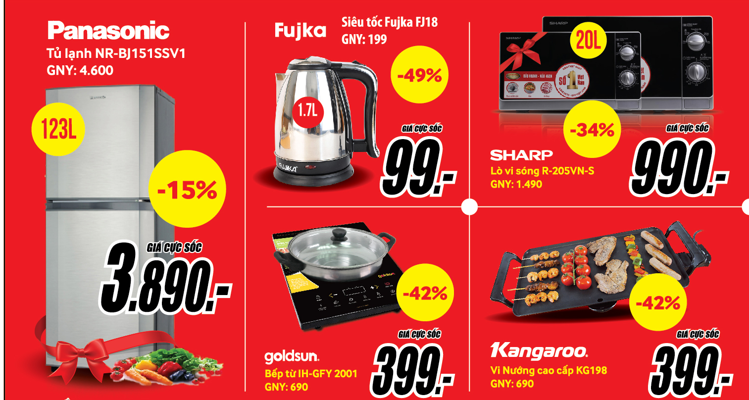 Đến với MediaMart trong dịp này, khách hàng còn dễ dàng chọn lựa, mua sắm các thiết bị gia dụng thiết yếu với giá rẻ: lò vi sóng 20L Sharp R-205VN-S chỉ 990.000 đồng, bếp từ Goldsun IH-GFY giảm 42% còn 399.000 đồng, vỉ nướng cao cấp Kangaroo KG198 giảm 42% giá chỉ 399.000 đồng, bình siêu tốc Fujika FJ18 giảm 49% còn 99.000 đồng…