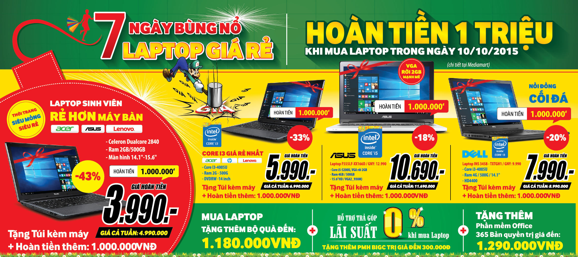 Là điểm bán hàng giá sốc trong Tuần khuyến mãi dành cho sinh viên do Sở Công thương phát động, MediaMart dành nhiều chính sách đặc biệt cho các bạn HS-SV khi mua các sản phẩm công nghệ tại đây. Laptop có mức giá rẻ hơn cả máy tính bàn, chỉ từ 3,99 triệu đồng, các bạn học sinh sinh viên đã sở hữu một chiếc laptop phục vụ cho nhu cầu học tập và giải trí hay dòng laptop Core i3 cũng chỉ có mức giá từ 5,99 triệu đồng. Một số model laptop giảm giá sâu khác như laptop Asus F555LF-XX166D giảm 18% còn 10,69 triệu đồng, laptop Dell INS 3458-TXTGH1 giá chỉ 7,99 triệu đồng…