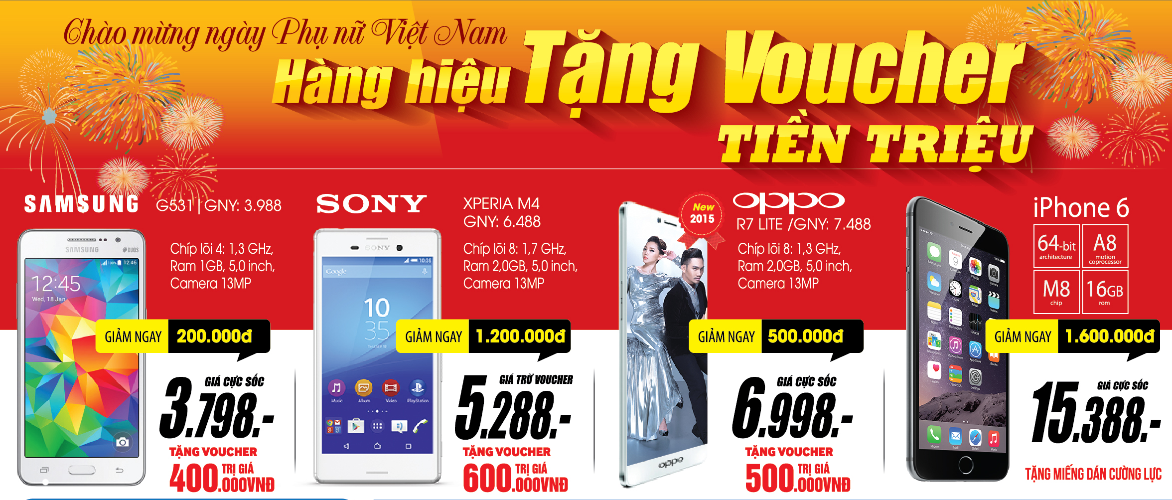 Ngày phụ nữ Việt Nam 20/10 sắp đến, những mặt hàng công nghệ luôn là sự lựa chọn tinh tế và thiết thực dành tặng một nửa thế giới. Những smartphone đáng mua đợt này có thể kể đến Samsung G531 giá 3,798 triệu đồng tặng voucher 400.000 đồng, Sony Xperia M4 giảm 1,2 triệu đồng còn 5,288 triệu đồng, Oppo R7 Lite giá sốc 6,988 triệu đồng tặng voucher 500.000 đồng, iPhone 6 chính hãng giảm 1,6 triệu đồng còn 15,388 triệu đồng tặng miếng dán cường lực.