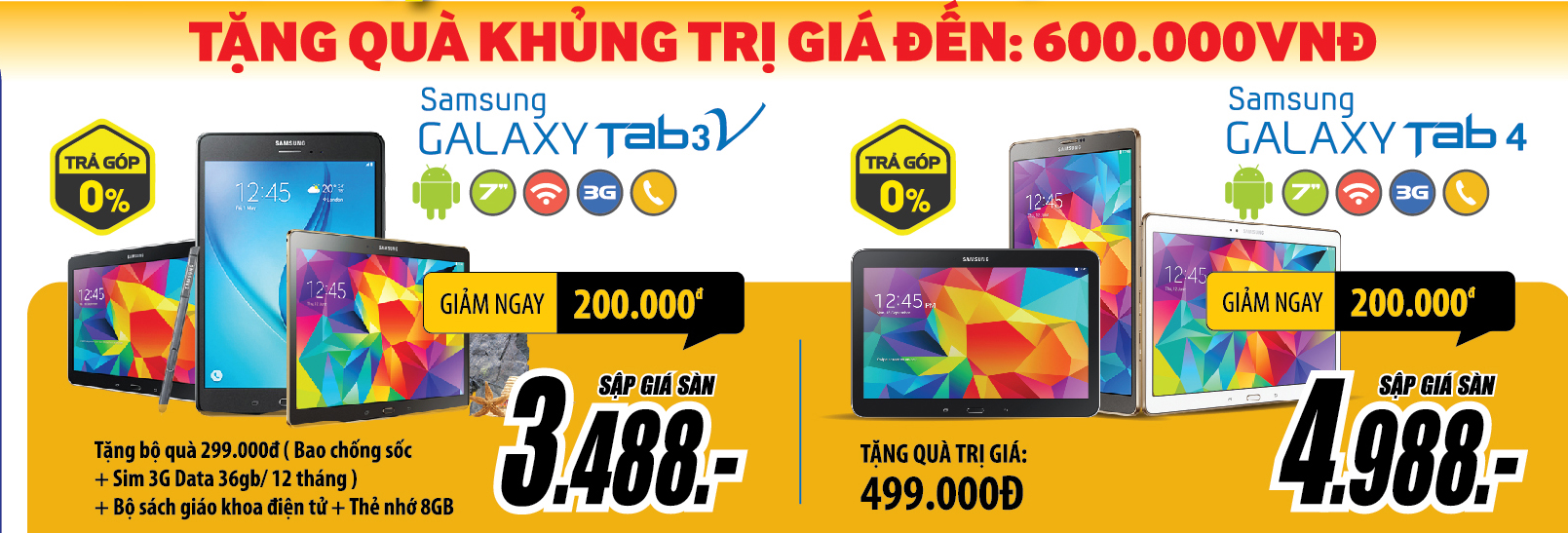 Được quan tâm không kém là loạt máy tính bảng hàng hiệu sập giá tiền triệu: Samsung Galaxy Tab 4 giá chỉ 4,988 triệu đồng tặng quà trị giá 499.000 đồng, Samsung Galaxy Tab3V giá chỉ 3,488 triệu đồng tặng bộ quà gồm bao chống sốc, SIM 3G, bộ sách giáo khoa điện tử và thẻ nhớ 8 GB.
