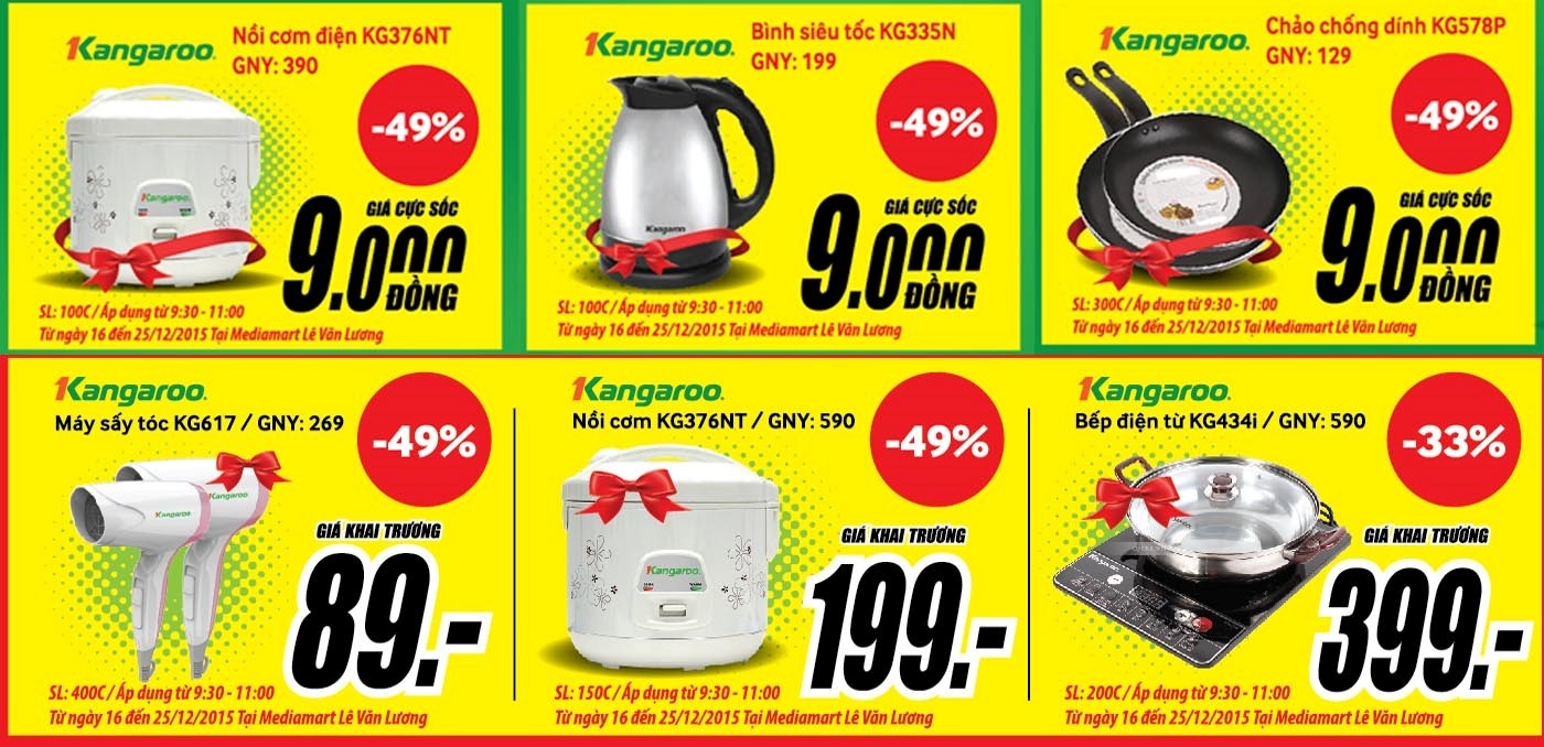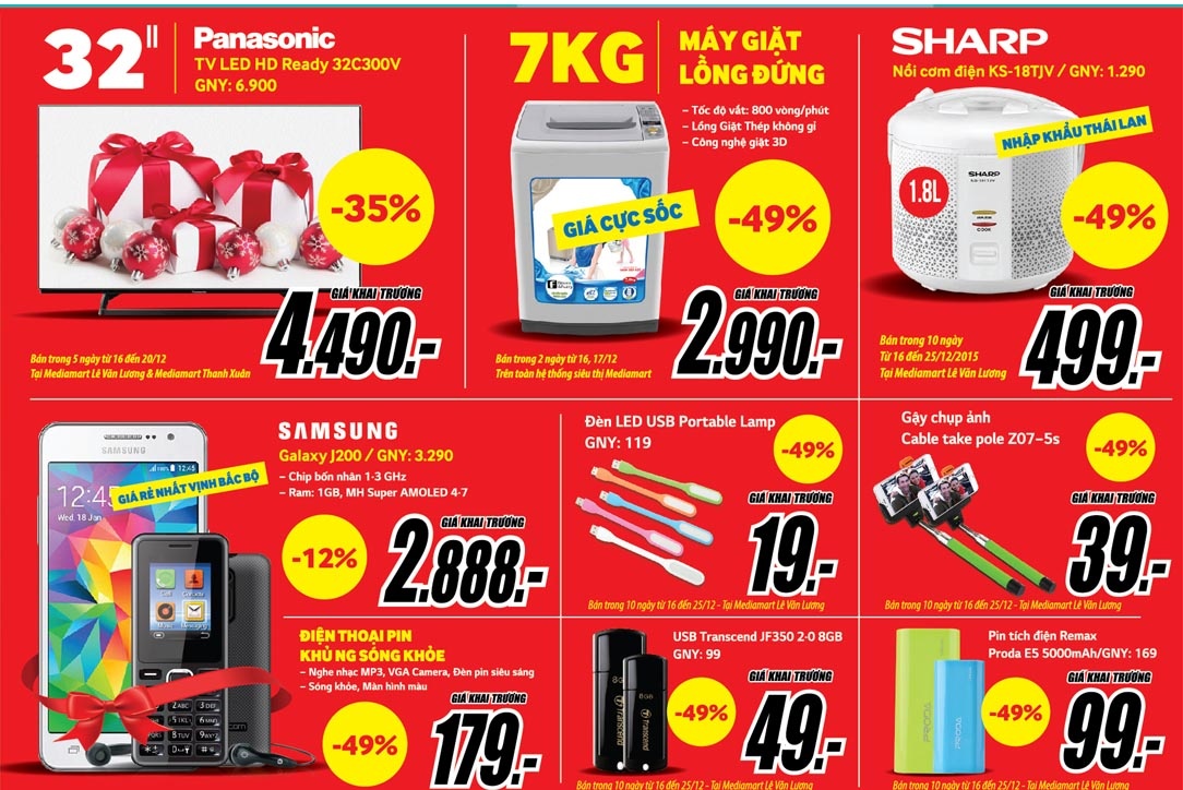 Tham gia sự kiện khuyến mãi lớn nhất trong năm tại MediaMart, khách hàng dễ dàng mua sắm các sản phẩm TV LED, máy giặt, tủ lạnh, thiết bị nhà bếp, smartphone, tablet chính hãng với mức giảm giá đến 50%: TV Slim LED 32 inch giá chỉ 3,69 triệu đồng, TV LED Panasonic 32 inch giảm 35% còn 4,49 triệu đồng, máy giặt lồng đứng 7 kg giá chỉ 2,99 triệu đồng, smartphone Samsung Galaxy J200 giá chỉ 2,888 triệu đồng, Nokia Lumia 430 chỉ 1,238 triệu đồng, điện thoại di động pin khủng sóng khỏe giá 179.000 đồng, USB 8 G giá chỉ 49.000 đồng, pin tích điện Remax 500 mAh giá còn 99.000 đồng…