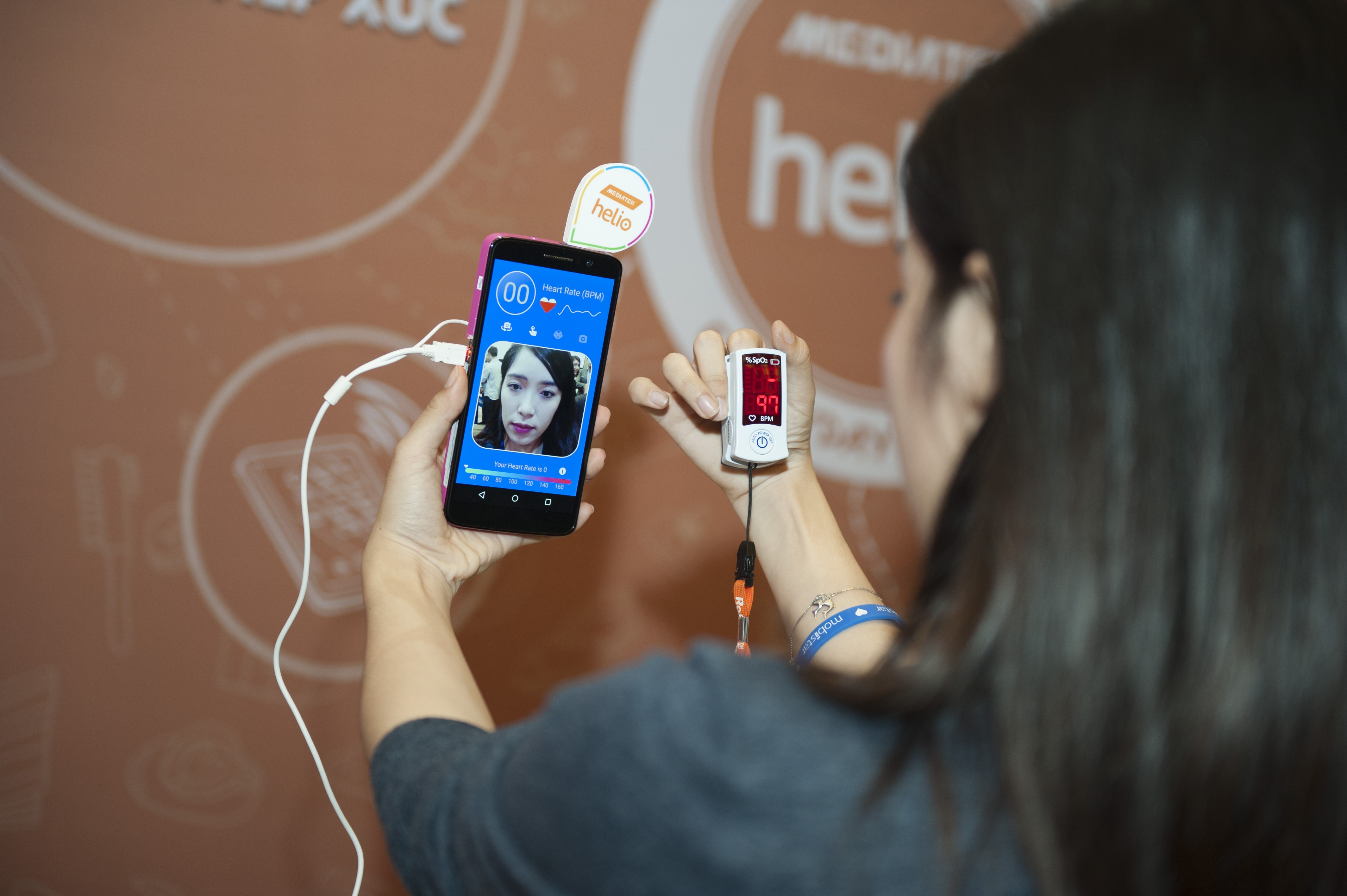 | Một bạn nữ đang thử tính năng đo nhịp tim không tiếp xúc được trang bị chip Helio. |