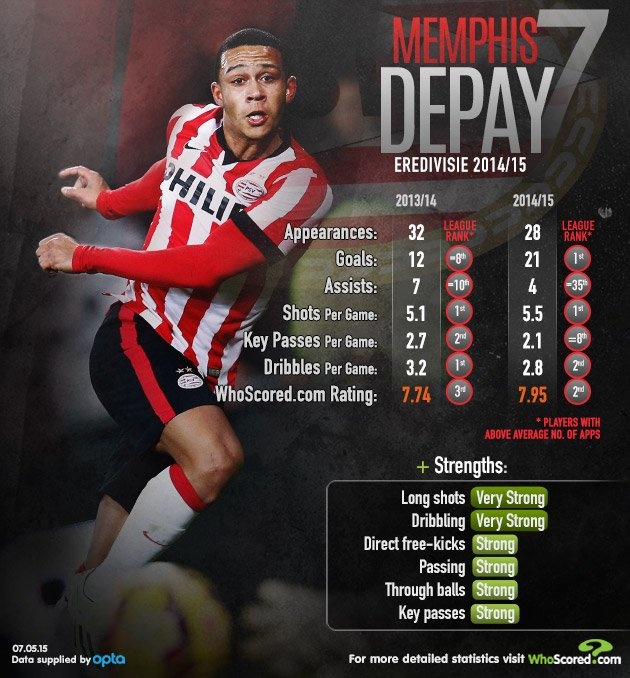 Trong khi đó, Memphis Depay ghi 12 bàn cho PSV sau 32 lần ra sân ở giải vô địch quốc gia Hà Lan mùa 2013 - 2014. Anh tiến bộ nhanh chóng khi 21 lần làm tung lưới đối phương sau 28 trận mùa này. Ngoài ra, cầu thủ sinh năm 1994 thực hiện 4 pha kiến tạo cho đồng đội lập công mùa này.