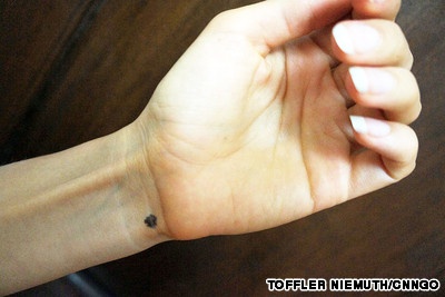 Nếu bạn không kịp mua chiếc vòng tay này, hãy xác định vị trí của huyệt rồi ấn từ 20 -30 lần trong 10 phút cho tới khi thấy cơ thể dễ chịu trở lại. Huyệt chống say tàu xe này nằm ở bên trong cánh tay trái, cách cổ tay hai lần chiều rộng của ngón tay cái, nằm giữa gân tay như hình vẽ.