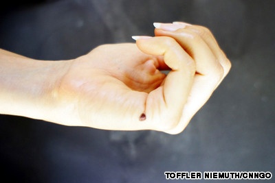 | Hãy ấn vào huyệt ở khoảng giữa ngón trỏ và ngón cái của bàn tay trái bằng ngón tay cái bên phải và ngược lại. |