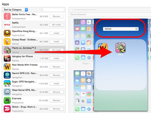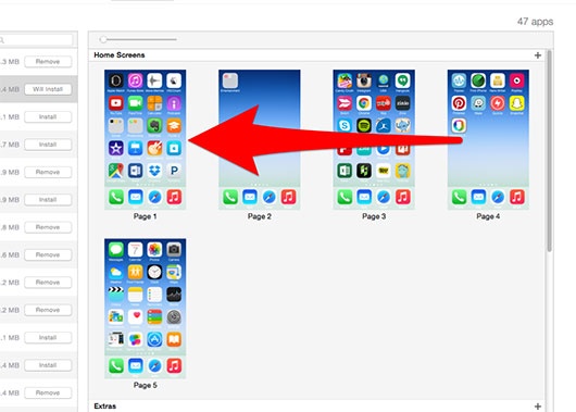 Sắp xếp thứ tự của ứng dụng hoặc thư mục trên màn hình bằng cách click vào ứng dụng/ thư mục, giữ con trỏ chuột và di chuyển đến vị trí mong muốn. Người dùng cũng có thể xóa ứng dụng bằng cách nhấp vào dấu "x" bên trên mỗi ứng dụng hoặc nút Remove trên iTunes. |
